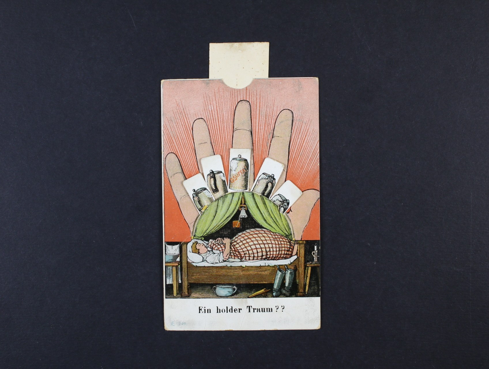 1142 Žertovné - bar. pohlednice "Ein holder Traum" s mechanickým pohybem obrázků, použitá 300