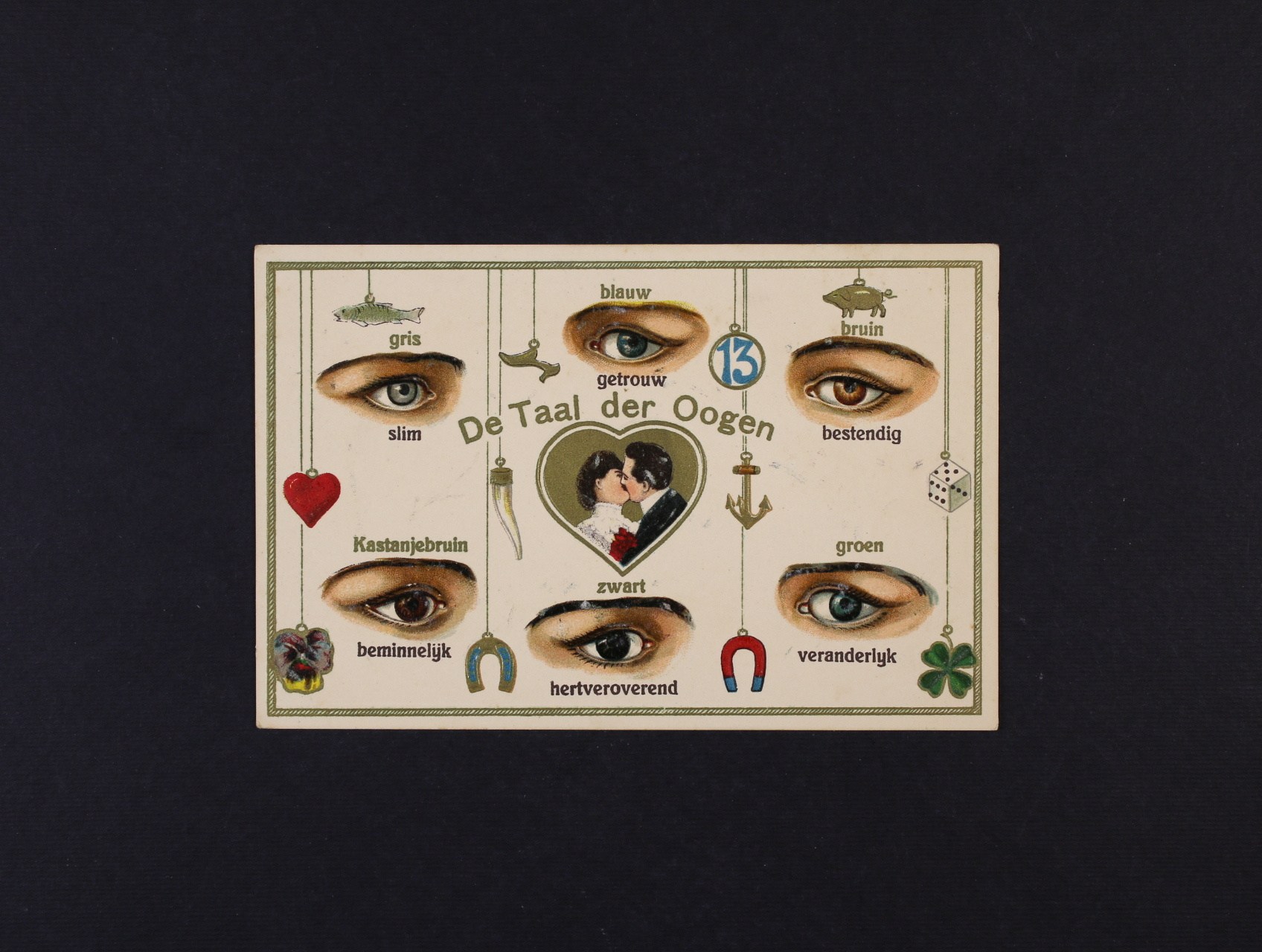 1143 Žertovné - bar. reliéfní litograf. koláž "Mluva očí", nepoužitá 200
