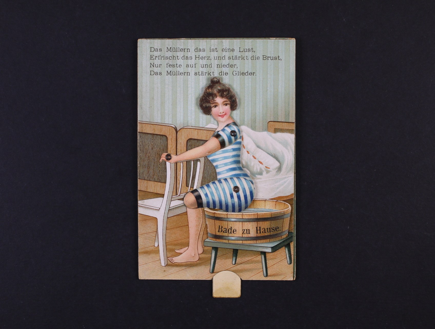 1144 Žertovné - bar. reliéfní litograf. pohlednice "Bade zu Hause" s mechanickým pohybem sedící dívky, nepoužitá 300