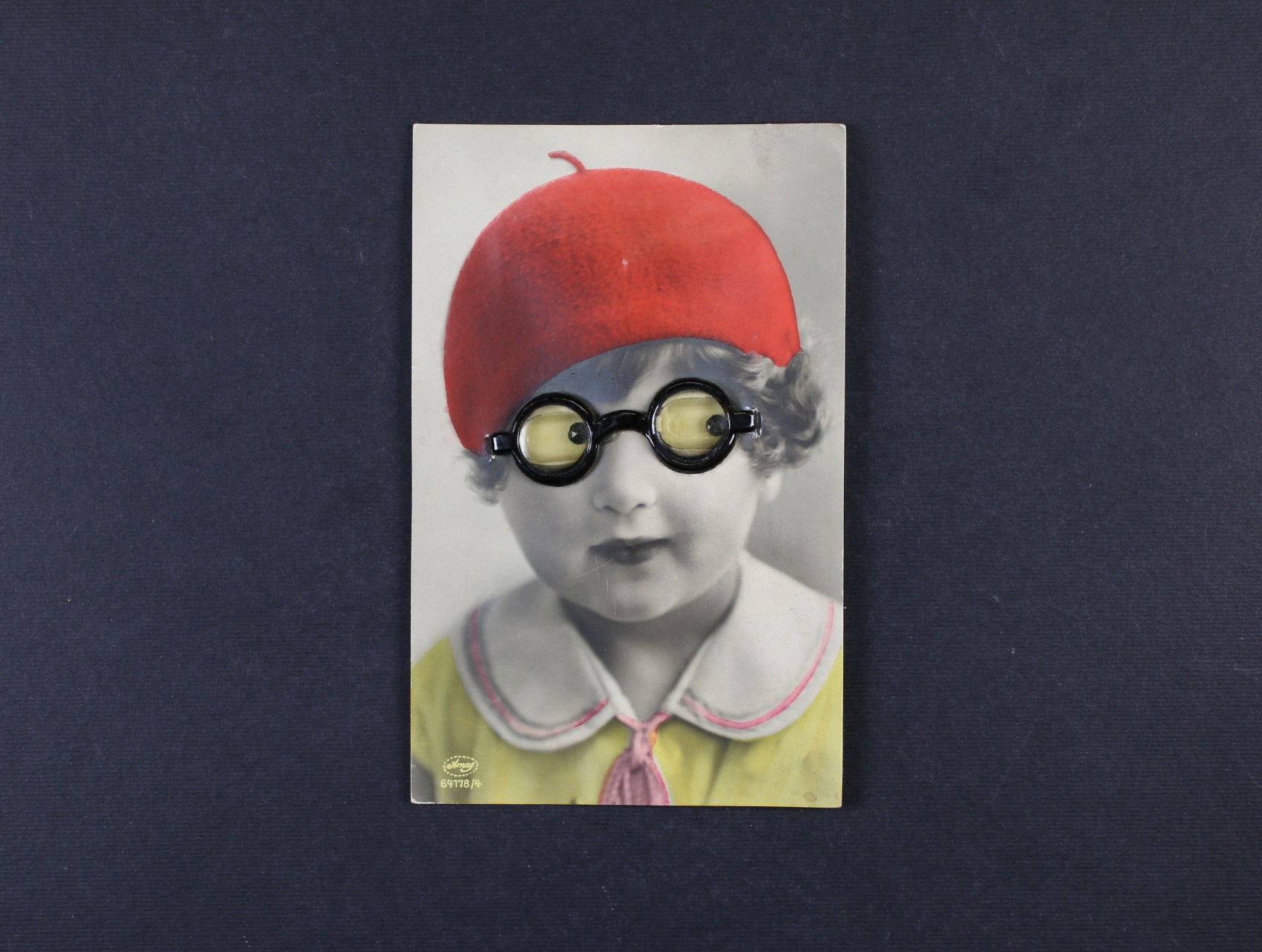 1145 Žertovné - barevná pískající pohlednice s obrázkem dívky s brýlemi, nepoužitá 300