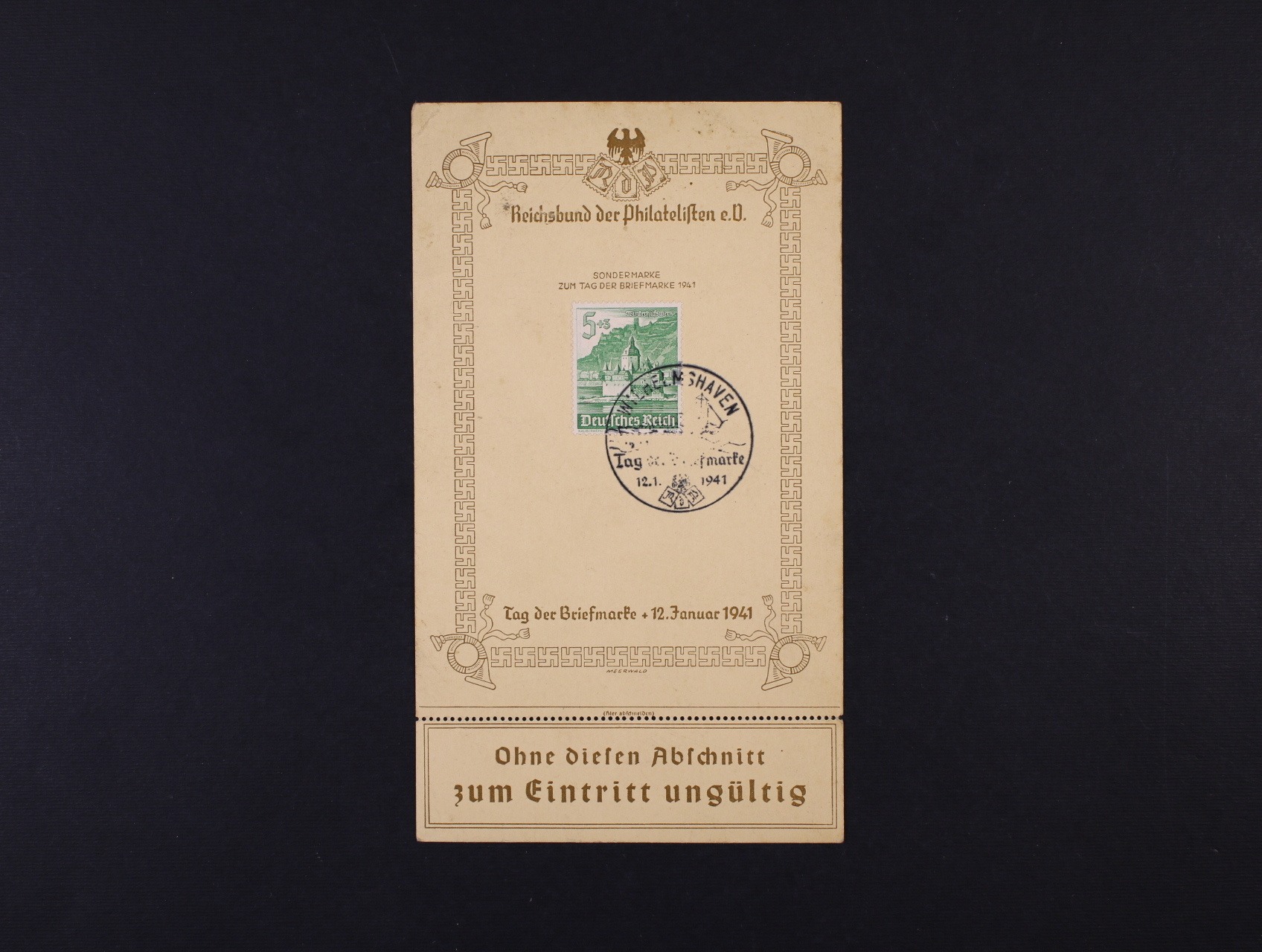 1146 vstupenka na Den filatelie 12. Januar 1941 s vylepenou zn. a pam. raz. WILHELMSHAVEN , zajímavé 300