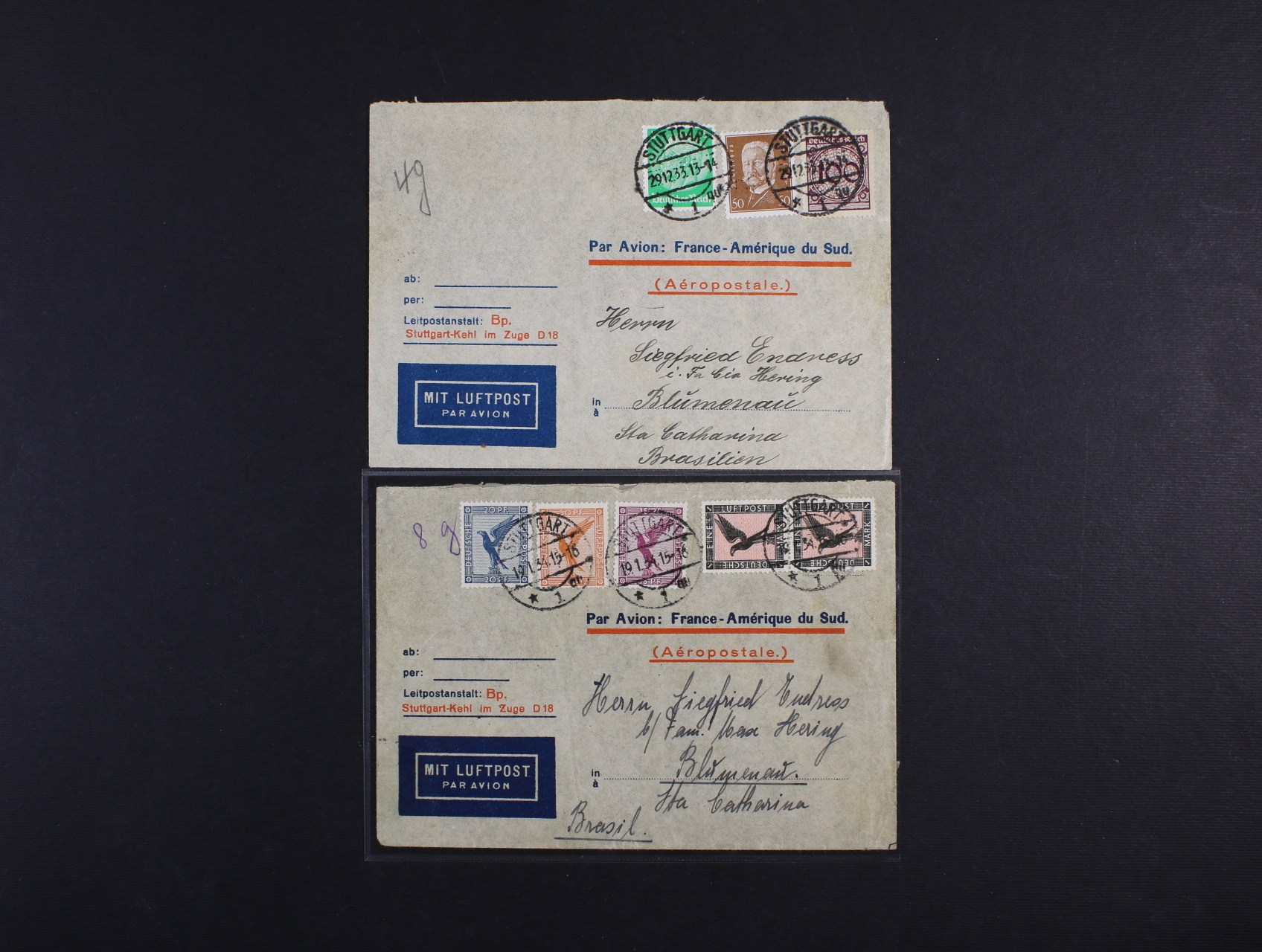 dva R-dopisy do Jižní Ameriky z let 1933 - 34 frank. zn. Mi. č. 379 - 382 dvoupáska), resp. 343, 420, 468, pod. raz. STUTTGART 19.1.1934, resp. 29.12.33 + průch. a přích. raz., zajímavé, dobrá kvalita