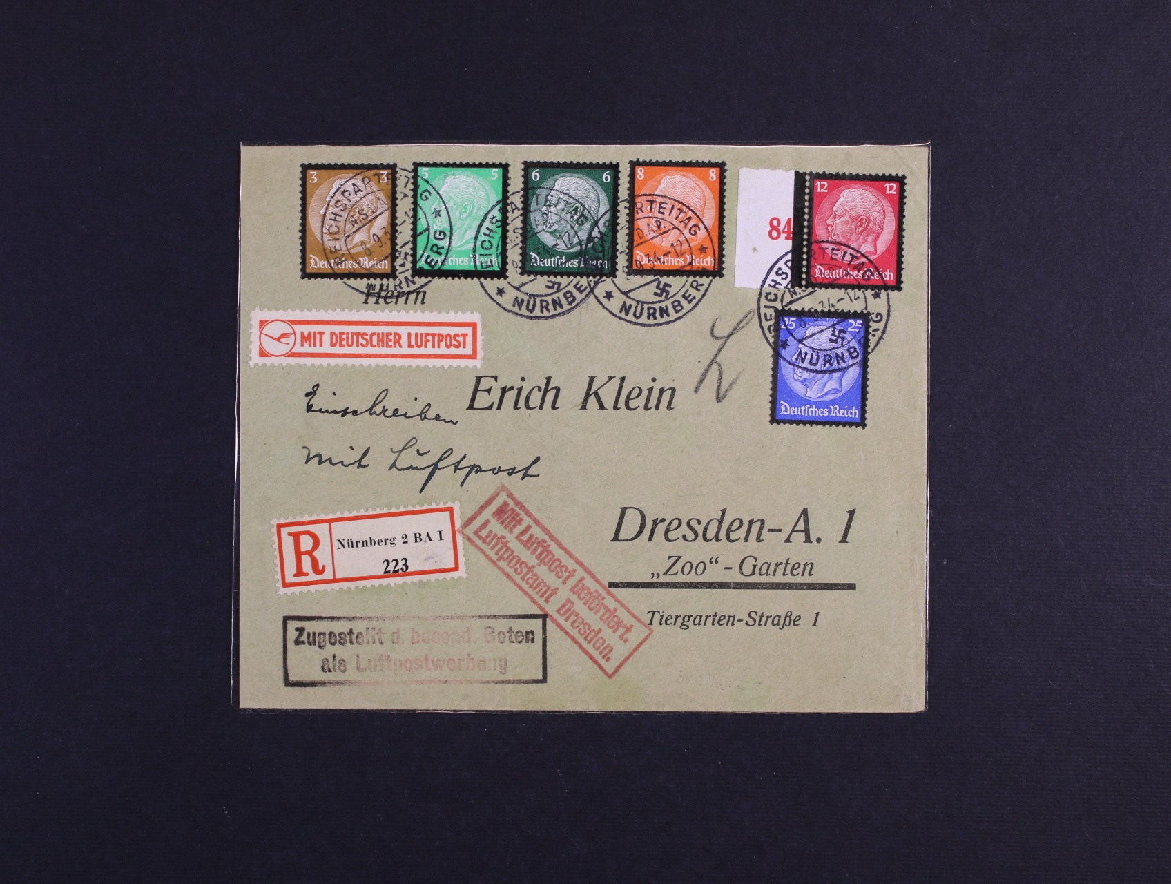 let. R-dopis do Drážďan frank. zn. Mi. č. 548 - 53, pod. raz. NÜRNBERG 8.9.34 + přídavné rámeč. let. kašety, průch. a přích. raz.