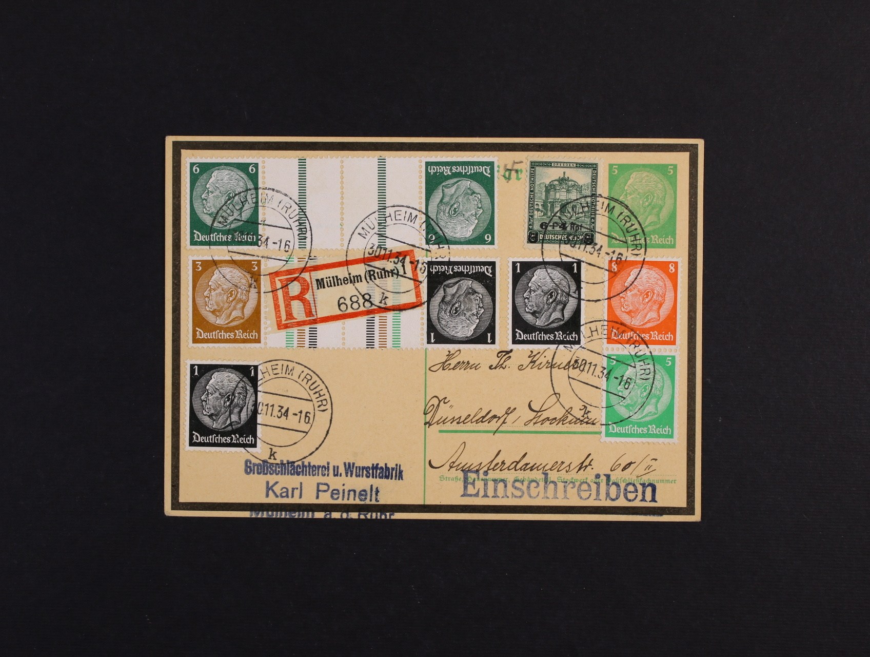 R-celina Mi. P 225 dofrank. zn. Mi. č. 463 + zn. Hindenburg (různá meziarší a spojky), pod. raz. MÜLHEIM 30.11.34, zajímavé