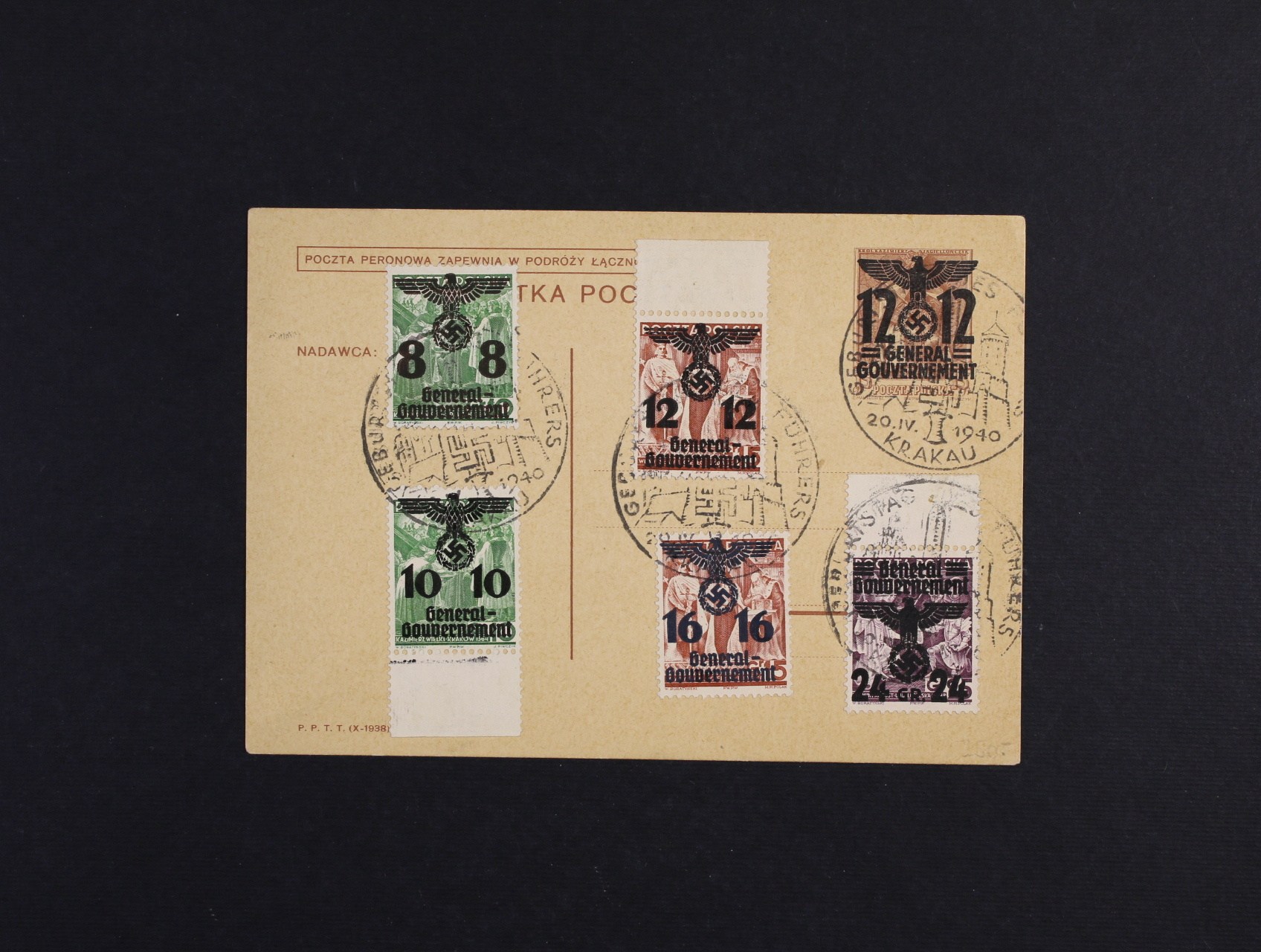 Generalgouvernament - celina Mi. P 4 s dolepenými zn. Mi. č. 19, 21, 22, 23, 24b, s pam. raz. KRAKAU 20.4.40