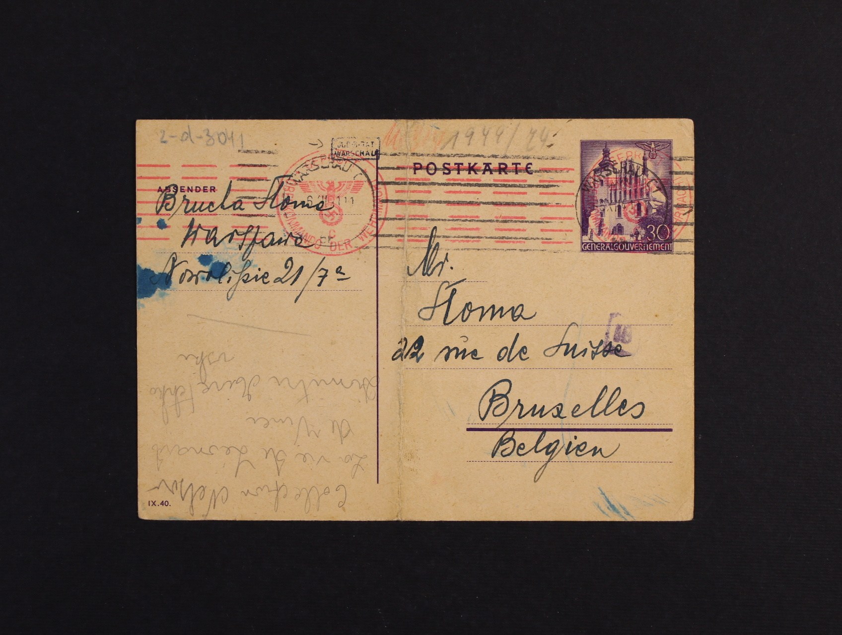 Generalgouvernament - KL s natištěnou zn. 30pf zaslaný do Bruselu, pod. raz. WARSCHAU C 1 6.12.41 + červené něm. cenzurní raz. + malé rámeč. raz. JUD.B..AT, uprostřed svisle přeložený, zajímavé