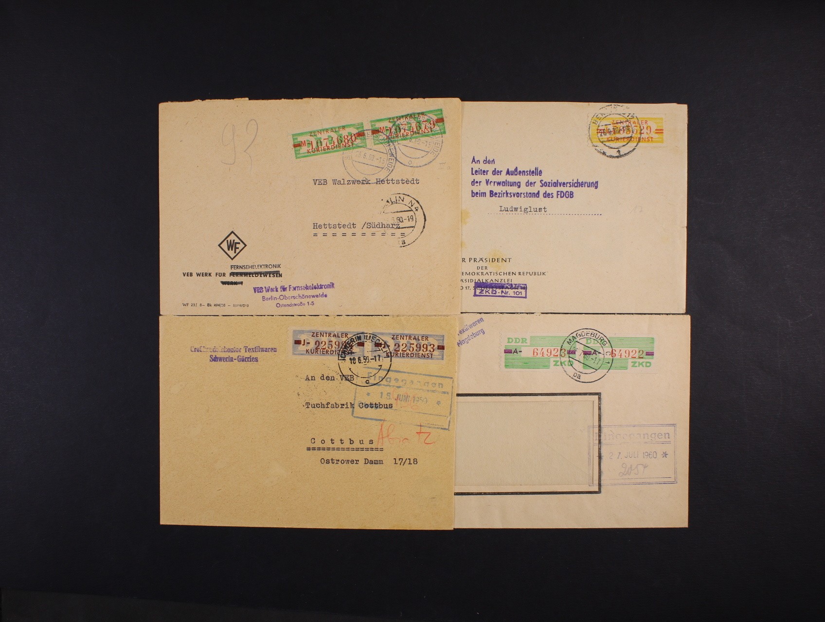 sestava 4 ks dopisů z let 1958 - 1960 frank. služ. zn., zajímavé, stopy pošt. provozu