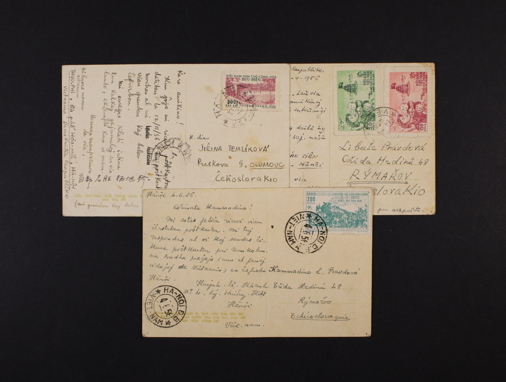 Vietnam - tři pohlednice do ČSR frank. zn. Mi. č. 24, 25, 26, 51, odeslané z Hanoje v r. 1956
