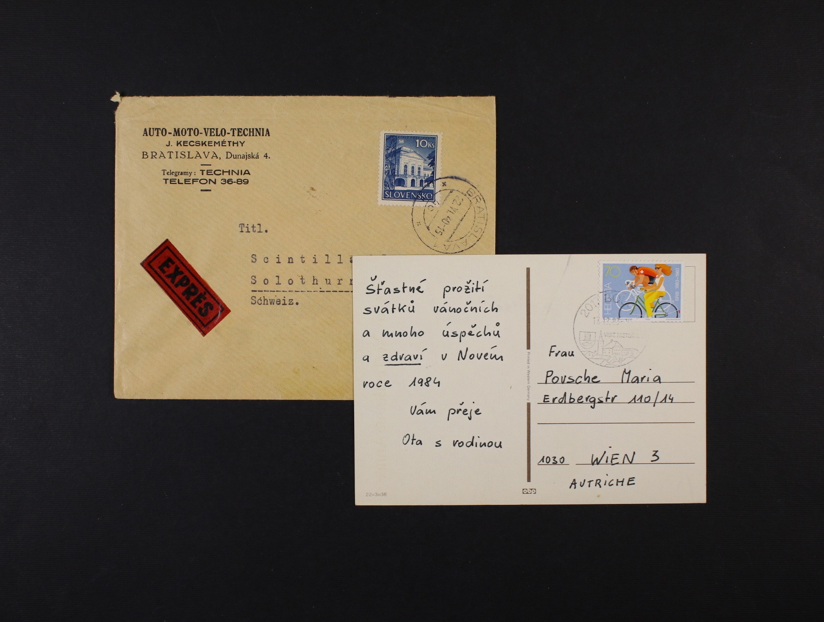 Cyklistika - firemní EXPRES celistvost (AUTO - MOTO - VELO - TECHNIA BRATISLAVA) do Švýcarska frank. zn. 10Ks Parlament, pod. raz. BRATISLAVA 22.6.40, přích. raz. SOLOTHURN 1 26.6.40 a celistvost ze Švýcarska na Slovensko frank. zn. s cyklistickým námětem z r. 1983