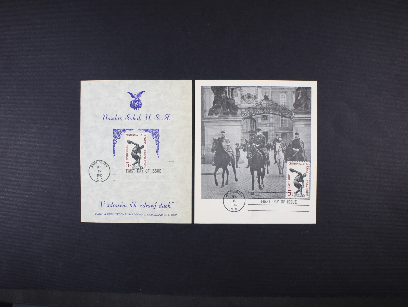 Pam. list Nazdar, Sokol, U.S.A. s vylepenou americkou zn. 5c 100.výročí Sokola s razítkem 1. dne vydání 15.2.1965 + černobílá fotografie T. G. M. s vylepenou stejnou zn. a raz. 1. dne vydání