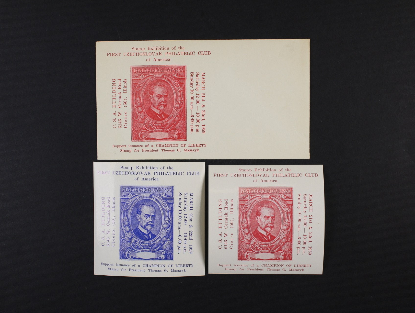 Pam. aršíky v červené a modré barvě vydané k výstavě zn. prvního československého filatel. klubu v USA r. 1959 + obálka s přítiskem v červ. barvě