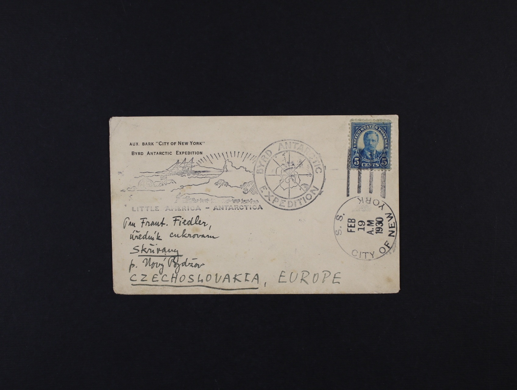 Polární výpravy - Byrdova výprava zřídila operační základnu ve Velrybí zátoce a pojmenovala ji MALÁ AMERIKA ("LITTLE AMERICA"), účastníkem této výpravy byl i první čech v Antarktidě Dr. Václav Vojtěch - originální obálka výpravy zaslaná do Čech Václavem Vojtěchem, frank. zn. 5c s raz. S.S.CITY OF NEW YORK 19.FEB.1930 + kašet BYRD ATLANTIC EXPEDITION + průch. a přích. raz., velmi zajímavé, vzácné