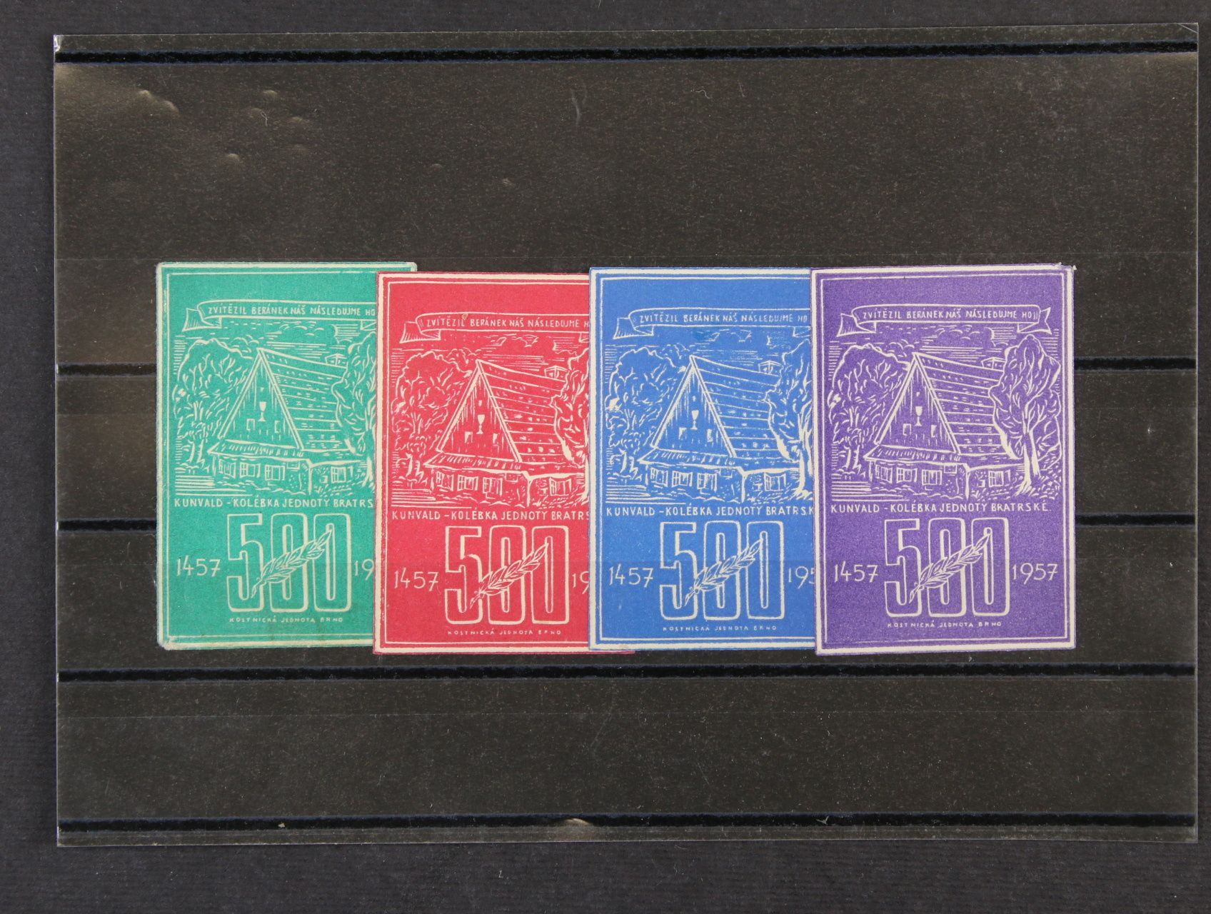 Propag. nálepky - sestava 4 ks nálepek k 500stému výročí Kostnické jednoty Brno 1457 - 1957 v různých barvách