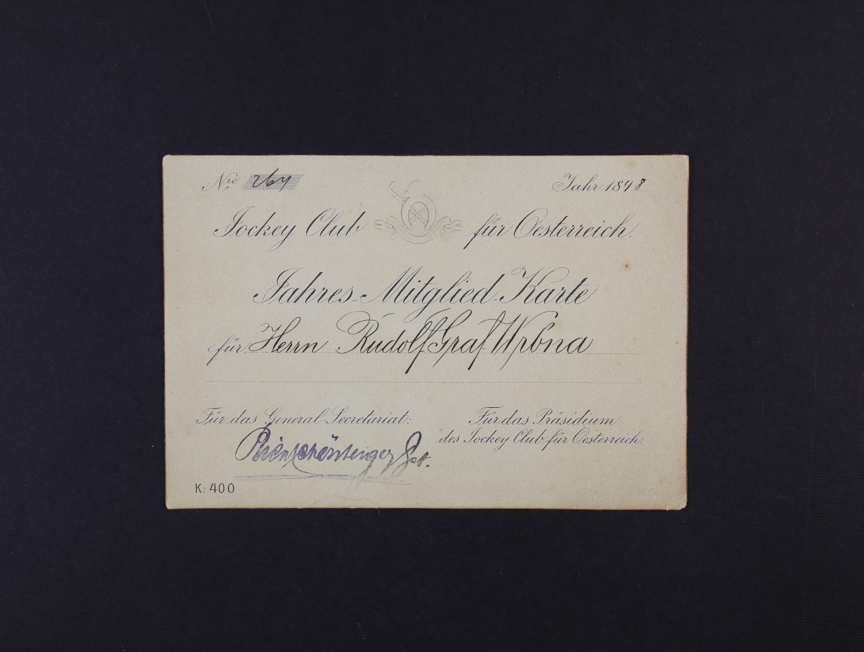 Roční členská karta pro rakouský "Jockey Club" č. 264 z r. 1898, na zeleném silném karton. papíře s reliéfním tiskem znaku klubu, velmi zajímavé, dobrá kvalita
