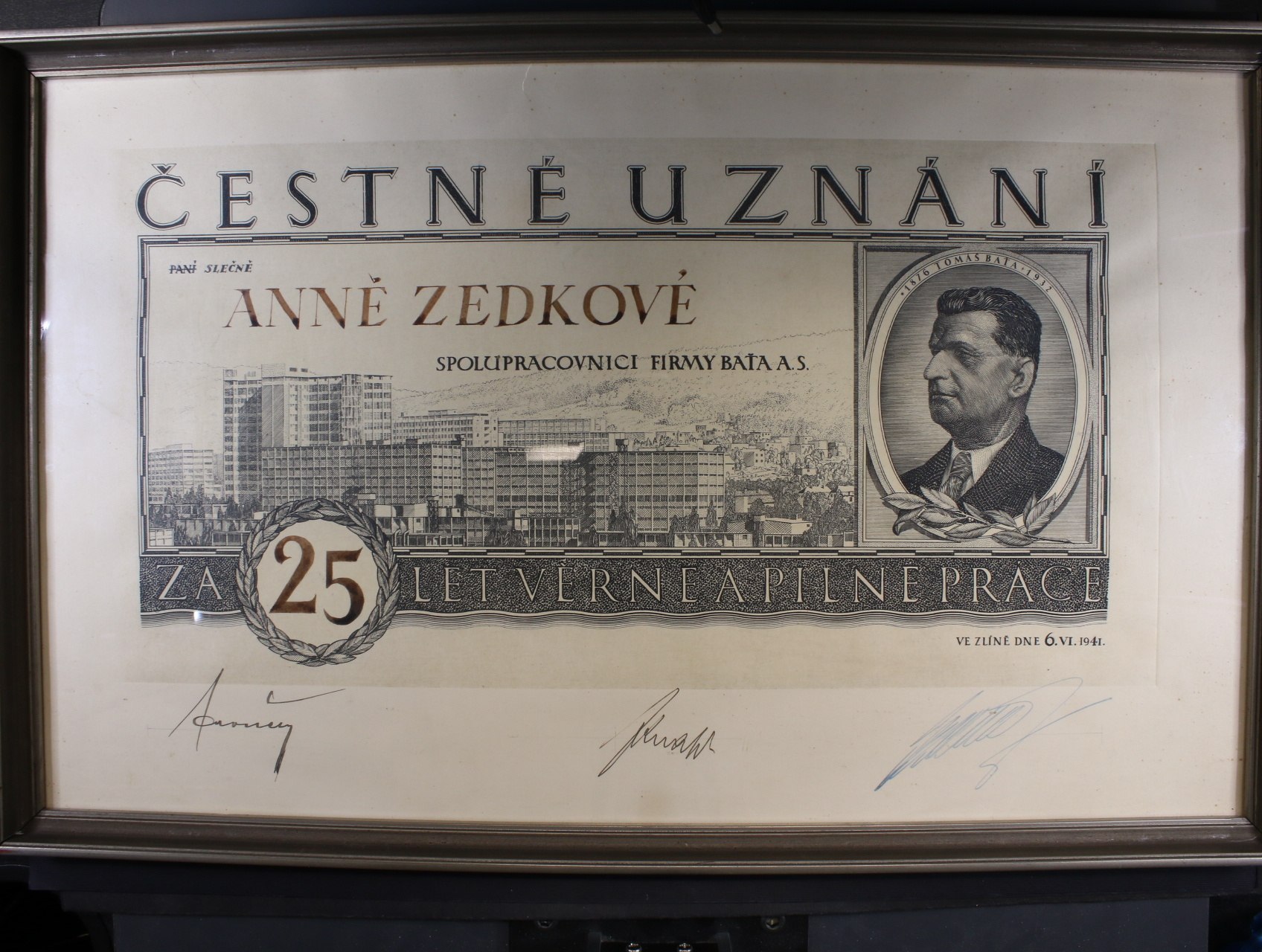 Čestné uznání za 25 let věrné a pilné práce u fy. BAŤA a.s. z r. 1941 v zasklené a zarámované paspartě se třemi podpisy, dekorativní, zajímavé