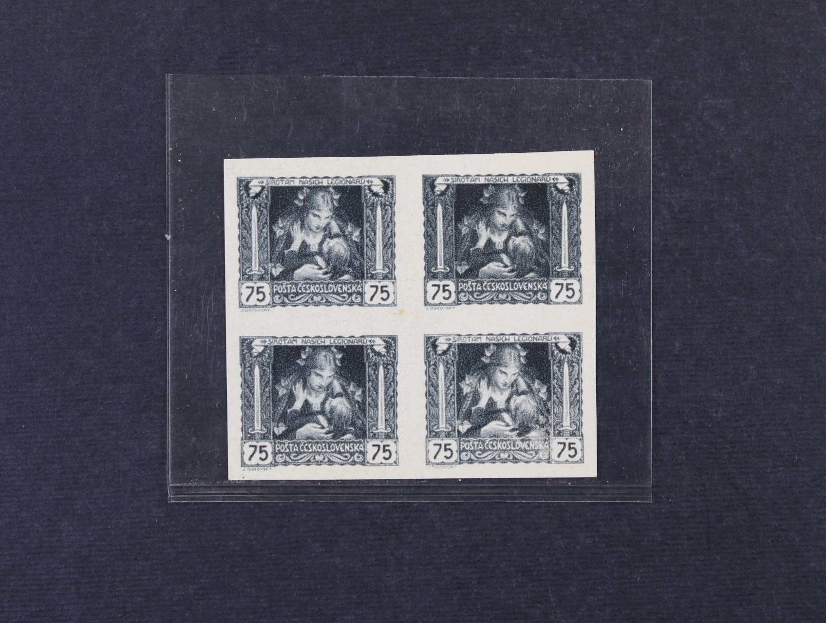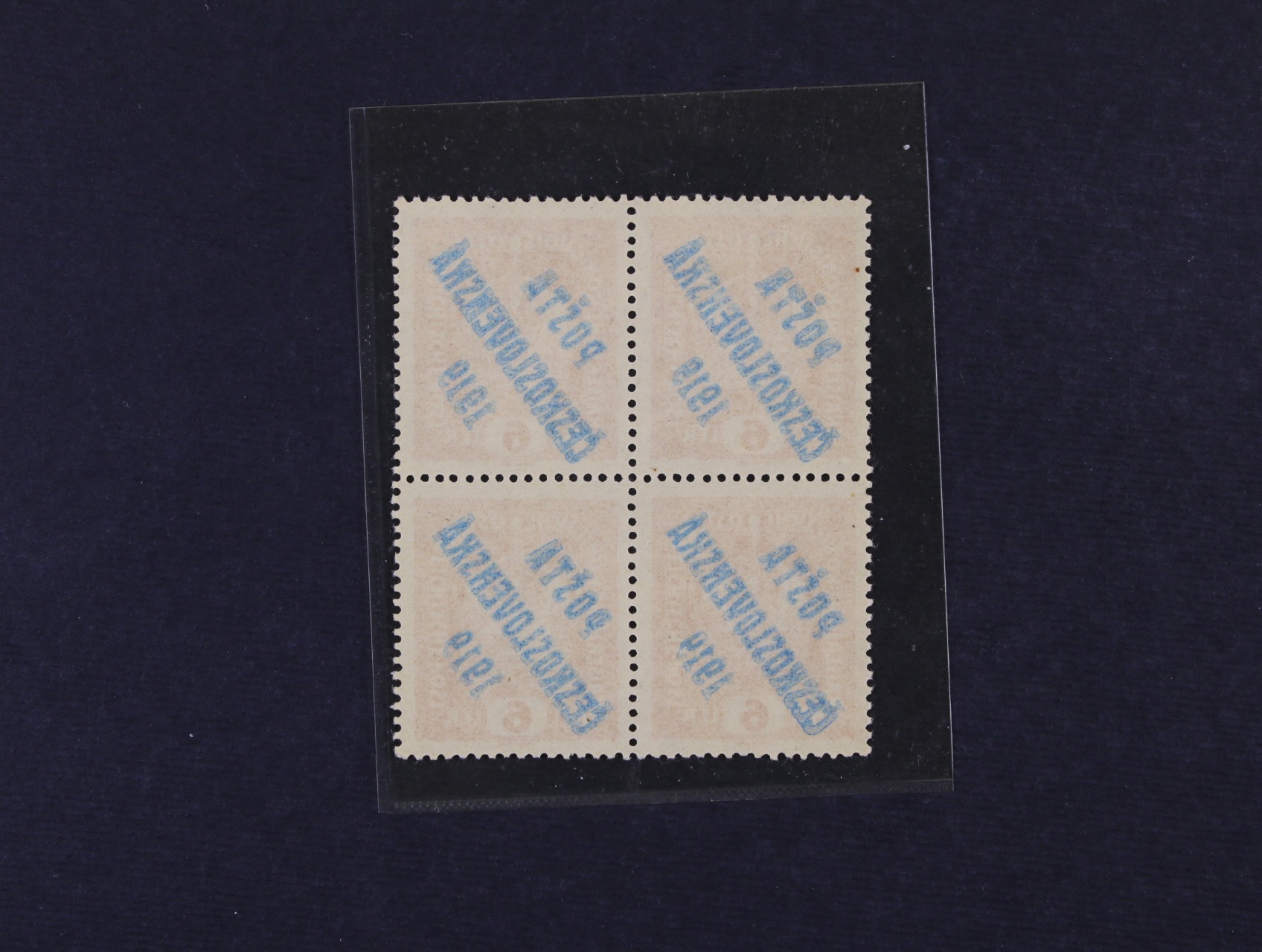 zn. č. 47 Ob ve čtyřbloku s výrazným stroj. obtiskem, kat. cena 1000 Kč