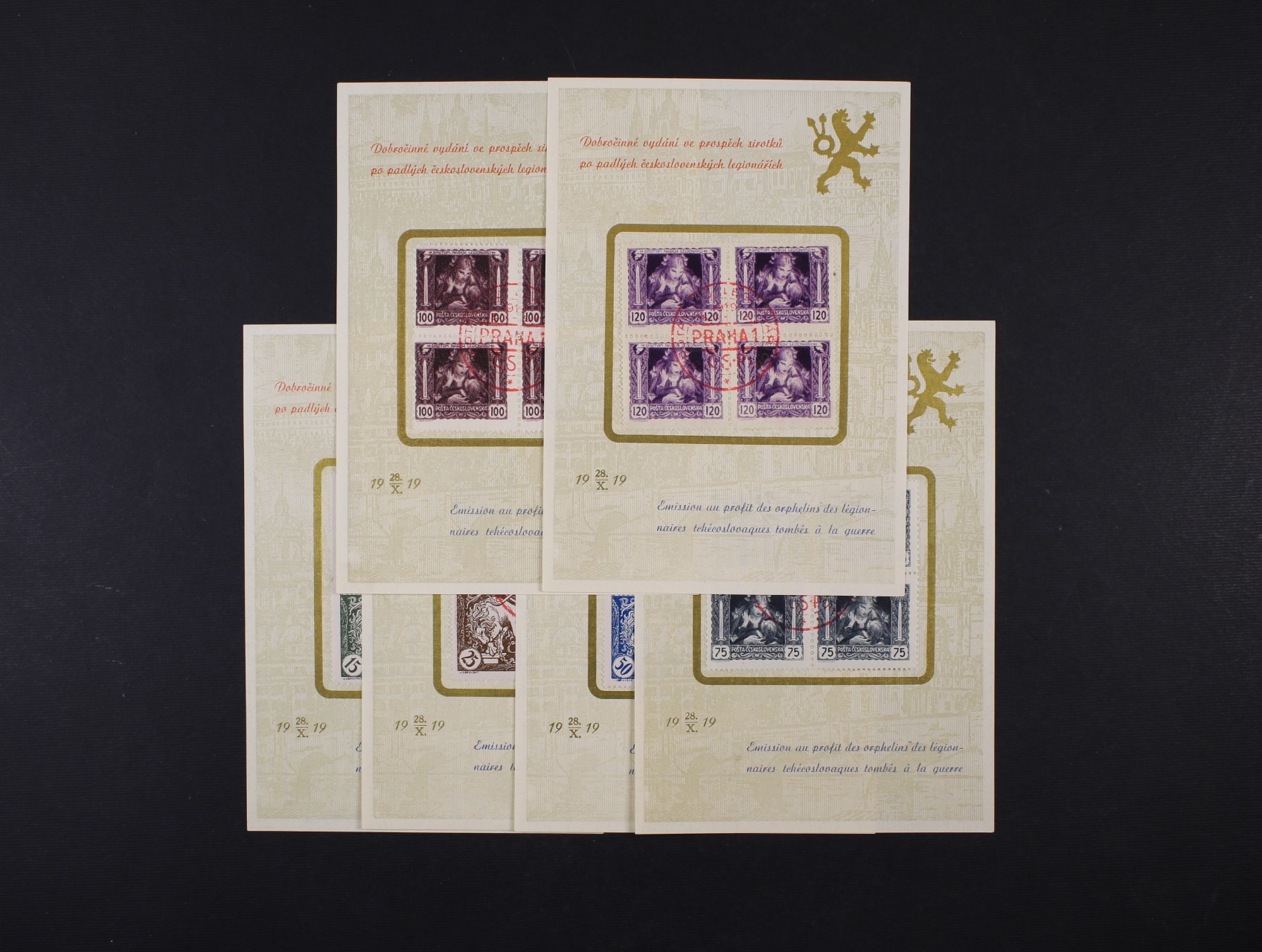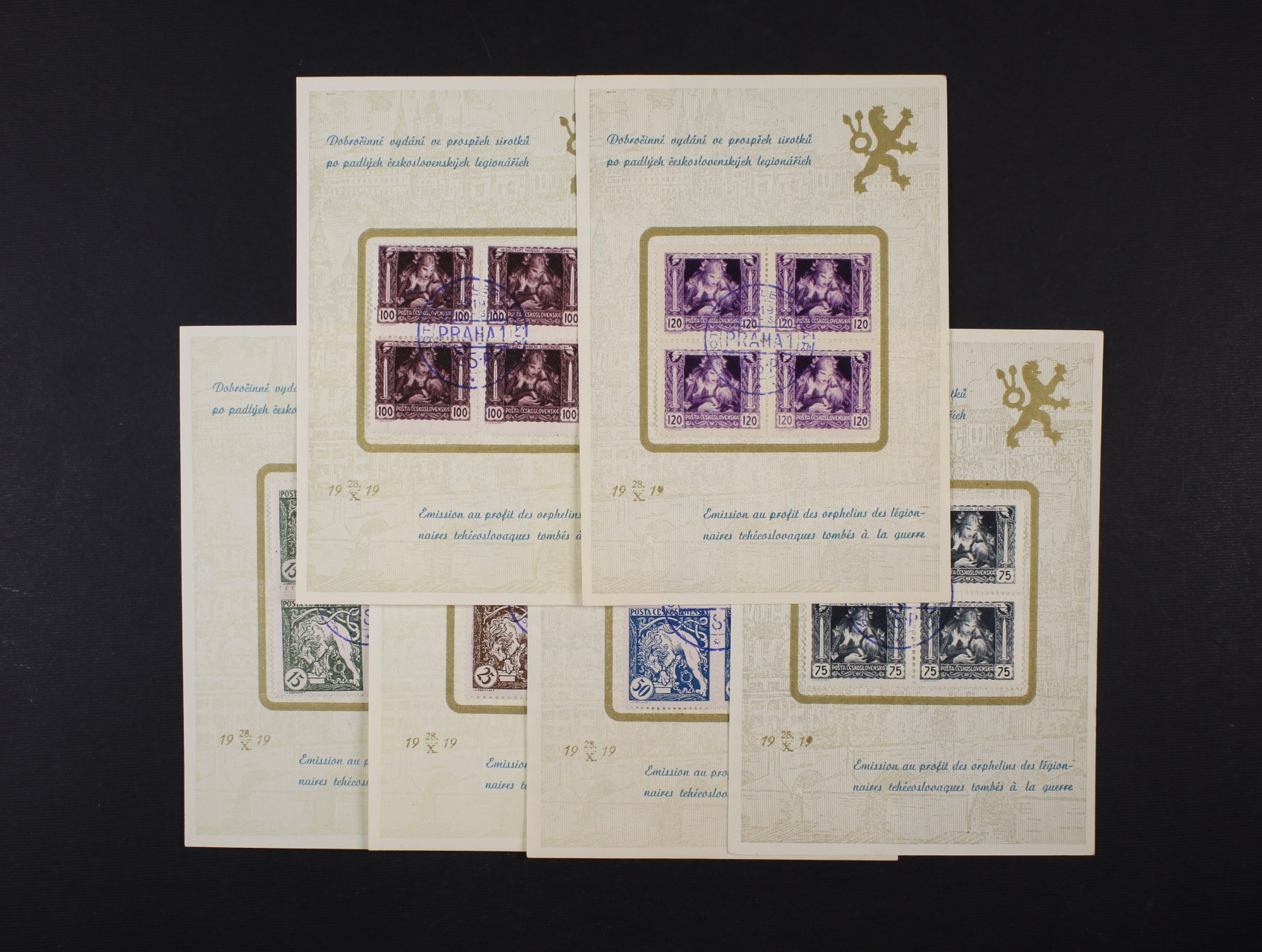 zn. č. 27-32, sestava 6ks oficiálních kartiček s vylepenými 4bloky s modrými kulatými nátisky
