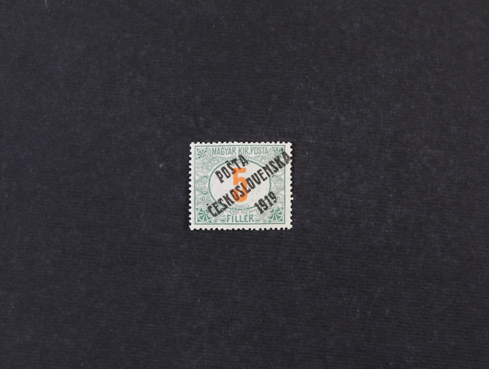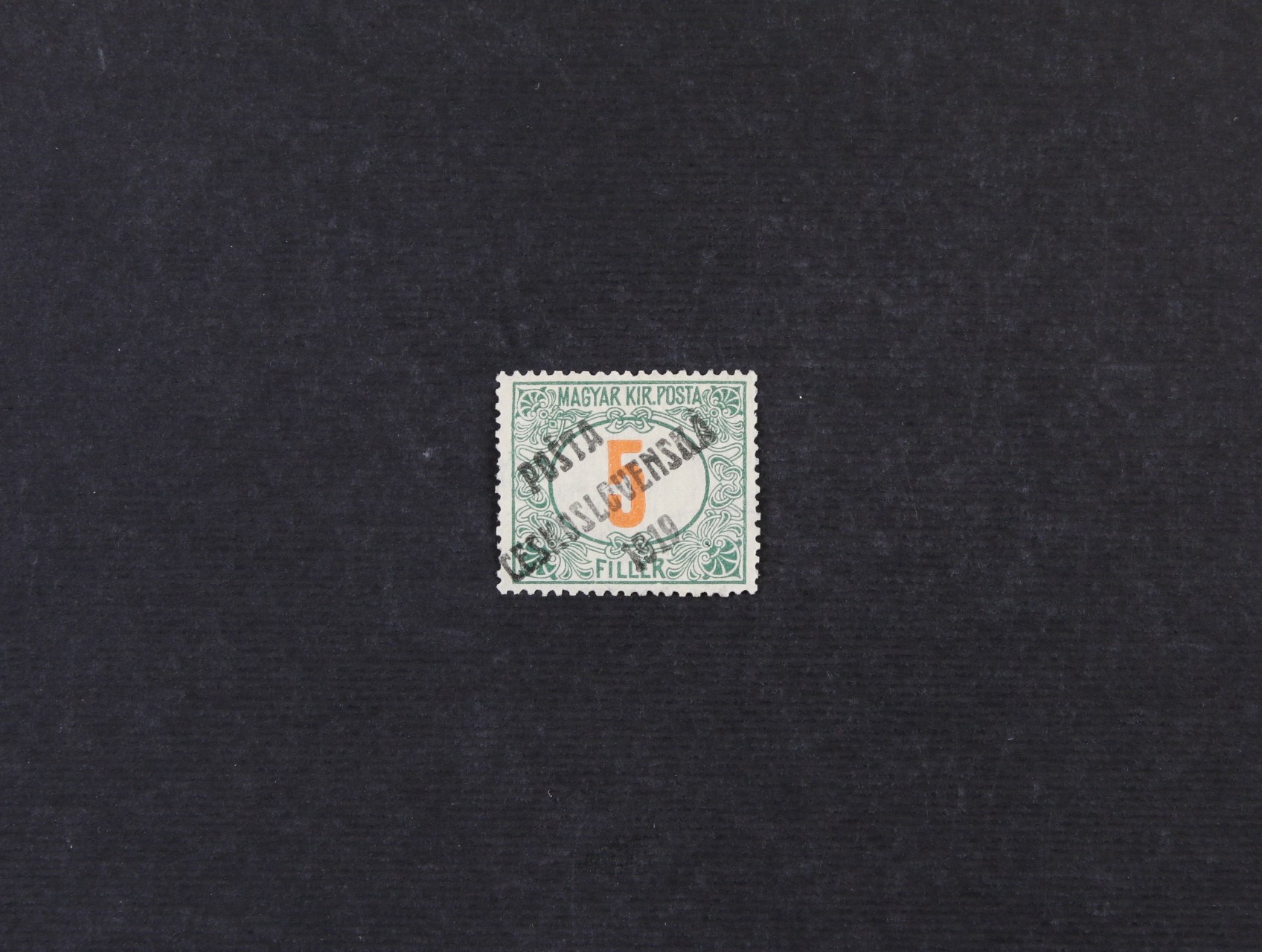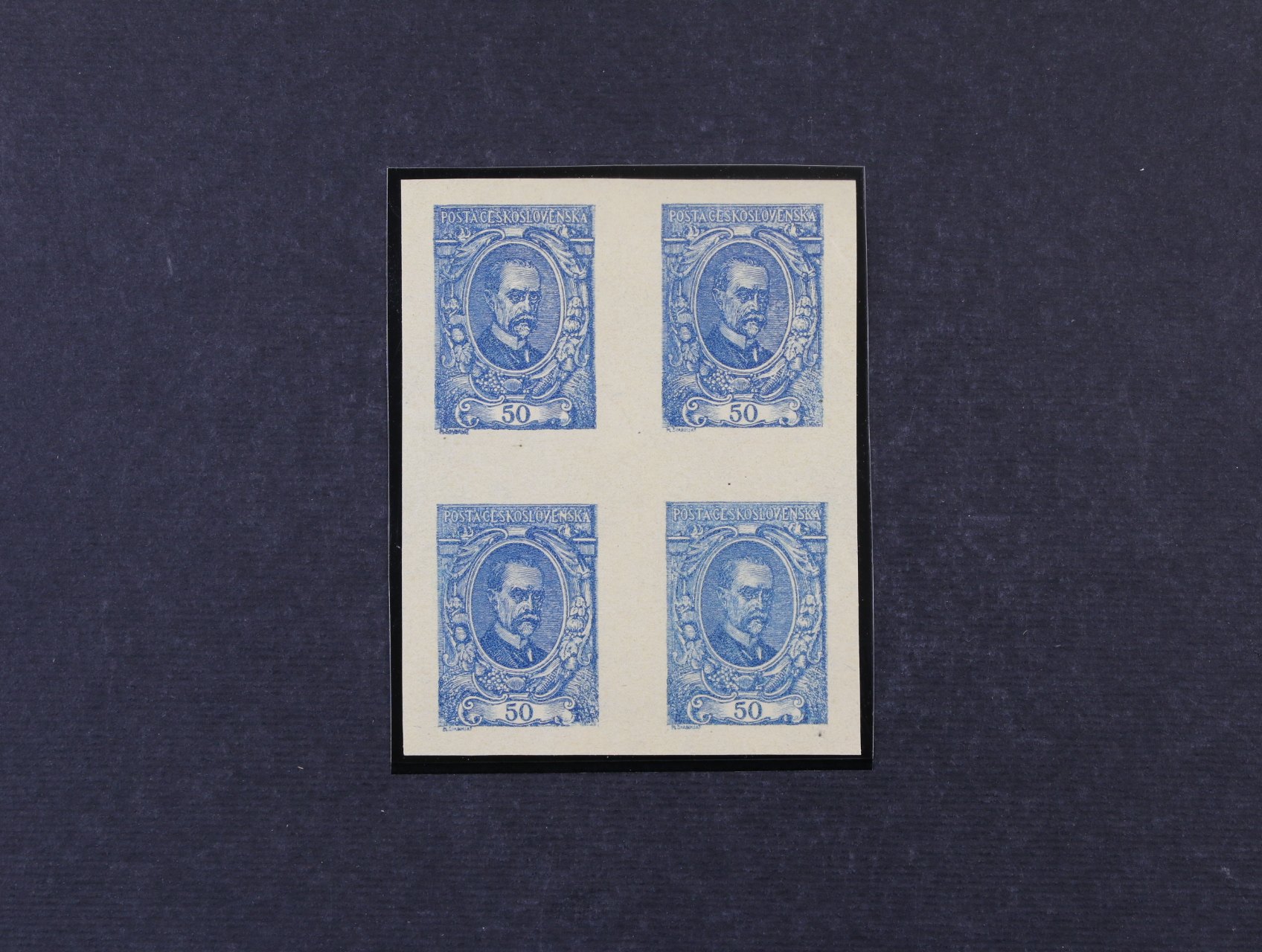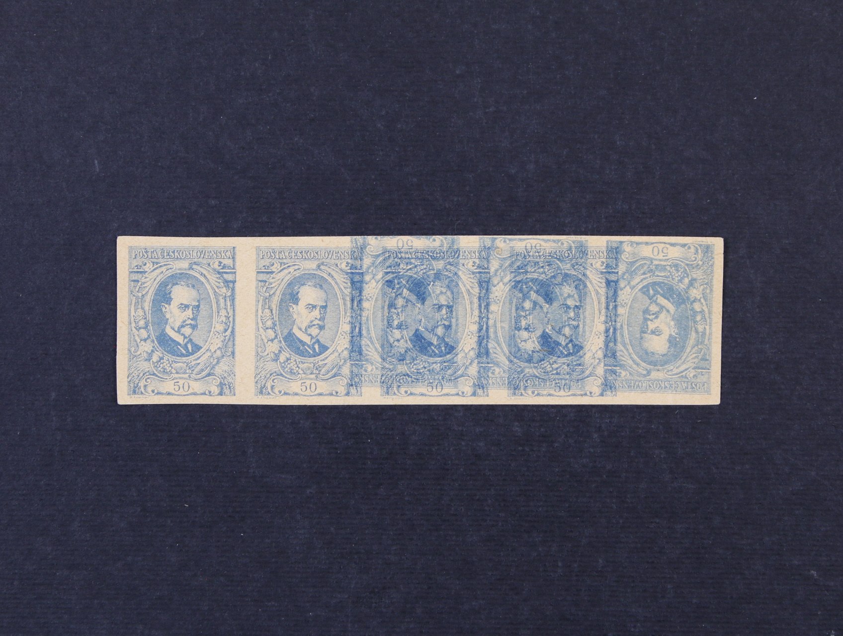 ZT zn. 50h malý formát v modré barvě ve vodorovné 5ti-pásce s protichůdným tiskem na dvou zn. vpravo, na zadní str. slabý stroj. otisk, na prostřední zn. uprostřed zeslabený papír