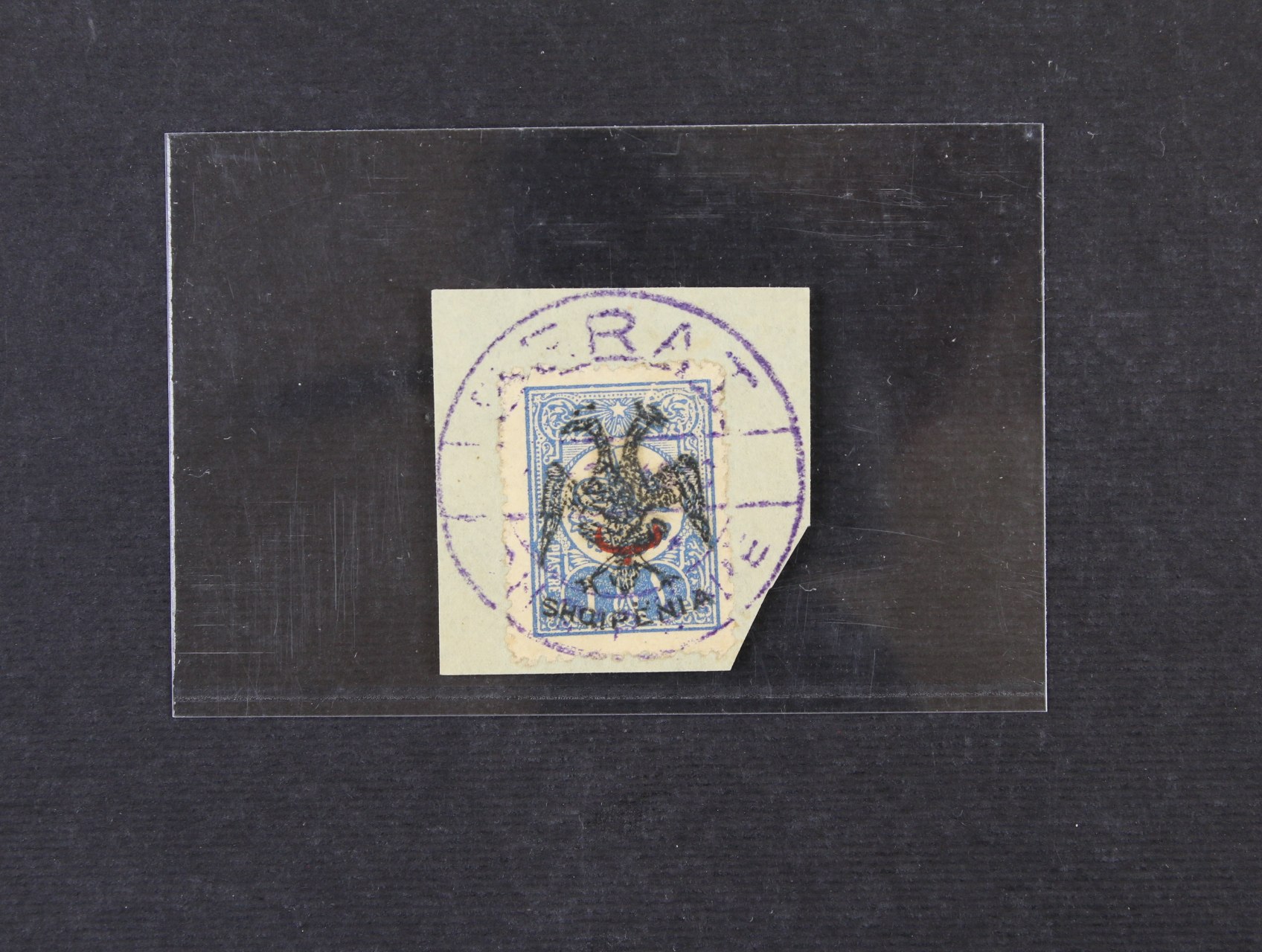 zn. Mi. č.14, turecká 1Pia ultramarínová s červeným tureckým přetiskem typu "BEYIYE" fialová (Mi.177) a s přetiskem "Orel" / SHQIPENIA, na výstřižku s raz. BERAT; bezvadná kvalita, kat. 2.100 EUR, minimální náklad