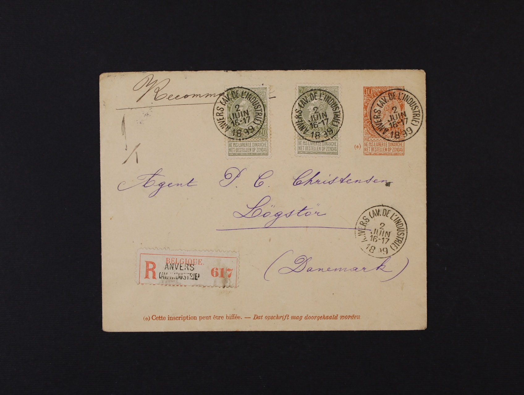 celinová obálka Mi. č. U 3 RECO do Dánska dofrank. zn. Mi. č. 54 (2x), pod. raz. ANVERS (AV. DE Ĺ INDUSTRIE) 2. JUN 1899, přích. raz. LÖGSTOR 4.6., zajímavé