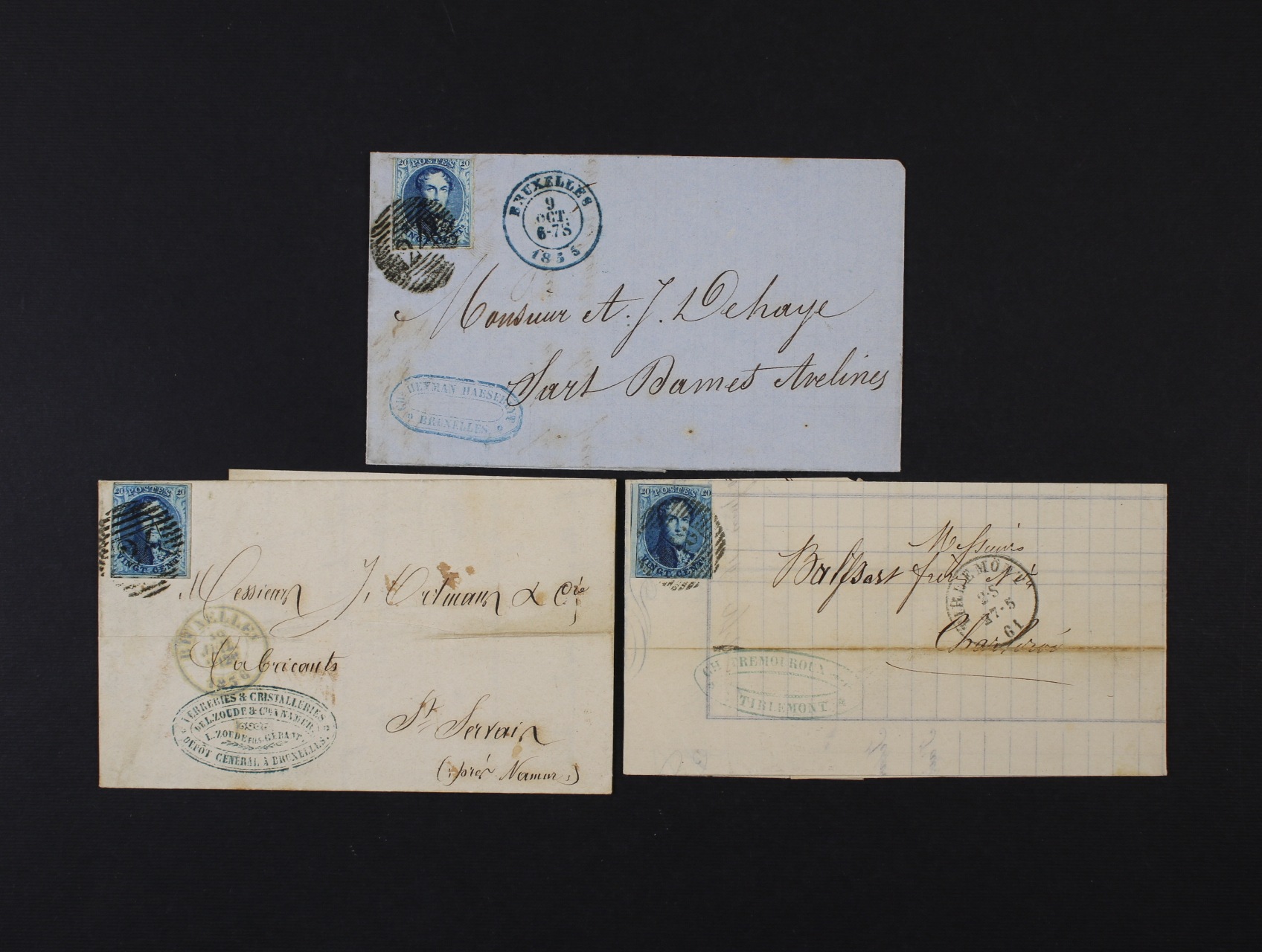 skl. firemní dopis z r. 1855 frank. zn. Mi. č. 6 I s čís. raz. 24 + DR BRUXELLES 9.OCT.1855, dtto frank. zn. Mi. č. 8 II s čís. raz. 24 + DR BRUXELLES 10.JUL.1856 + dtto frank. zn. Mi. č. 8 II s čís. raz. + DR TIRLEMONT 27.5.1861, zajímavé, dobrá kvalita