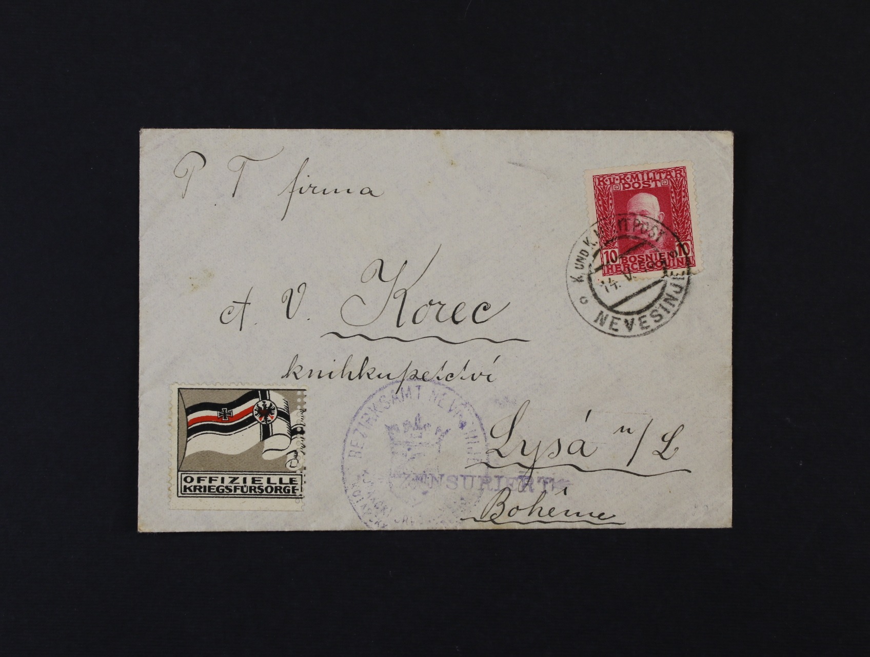 celistvost Rakouské polní pošty v Bosně a Hercegovině, pod. razítko 14. 5. 16. Nevesinje do Čech Lysá n. Labem, s nalepenou propagační nálepkou oficiální válečné pomoci