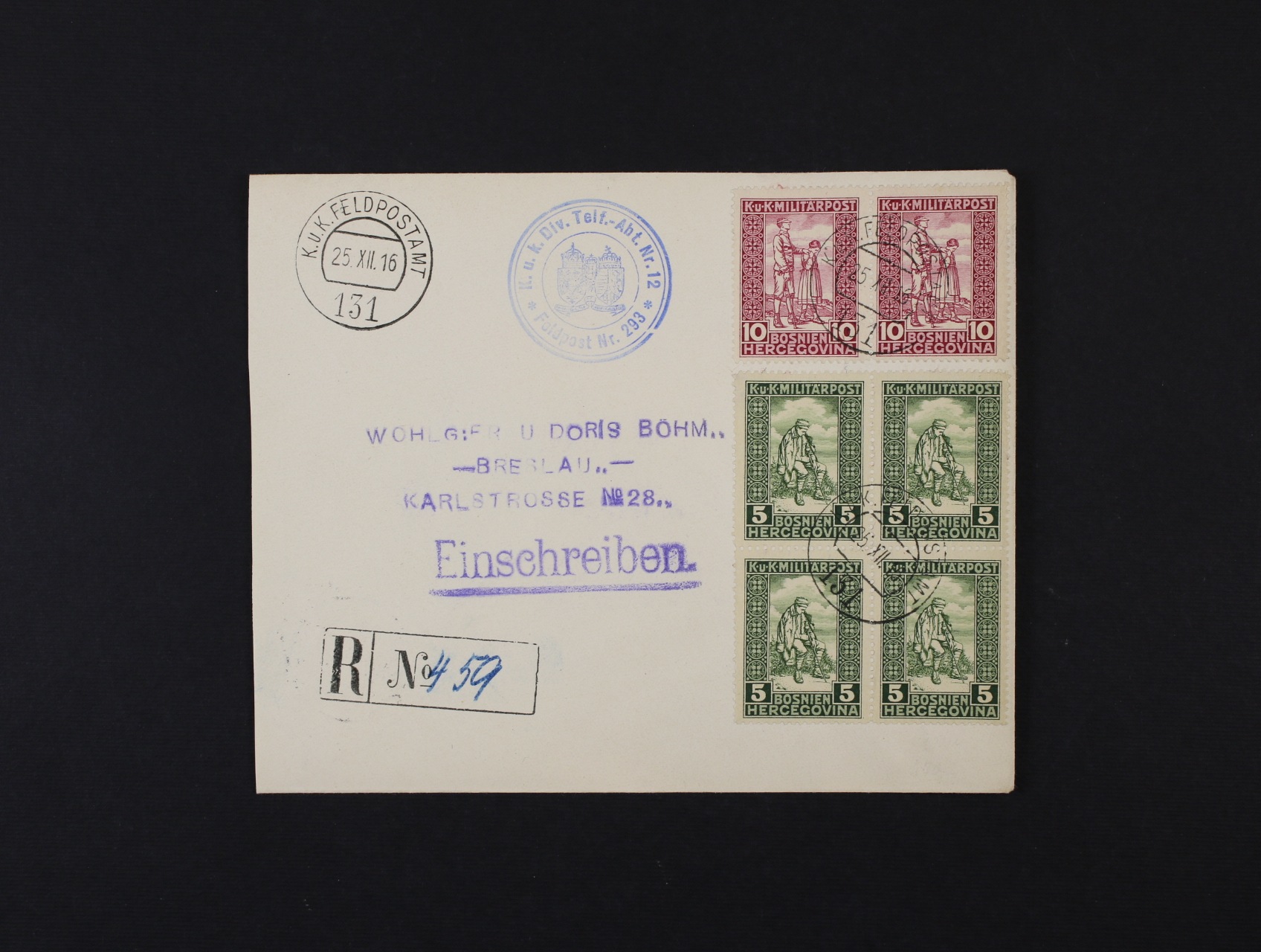 R-dopis do Německa frank. zn. Mi. č. 98 ve dvoupásce + 97 ve čtyřbloku, pod. raz. K.u.K. MFPA 131 25.12.16 + modré útvar. raz. a přích. raz
