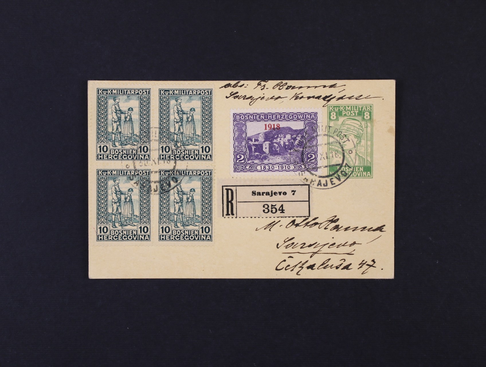 Reko KL 8H dofr. zn. 2H 1918 a 4-blokem10h „Invalida“, zasláno v místě, pod. raz. SARAJEVO 30.11.18