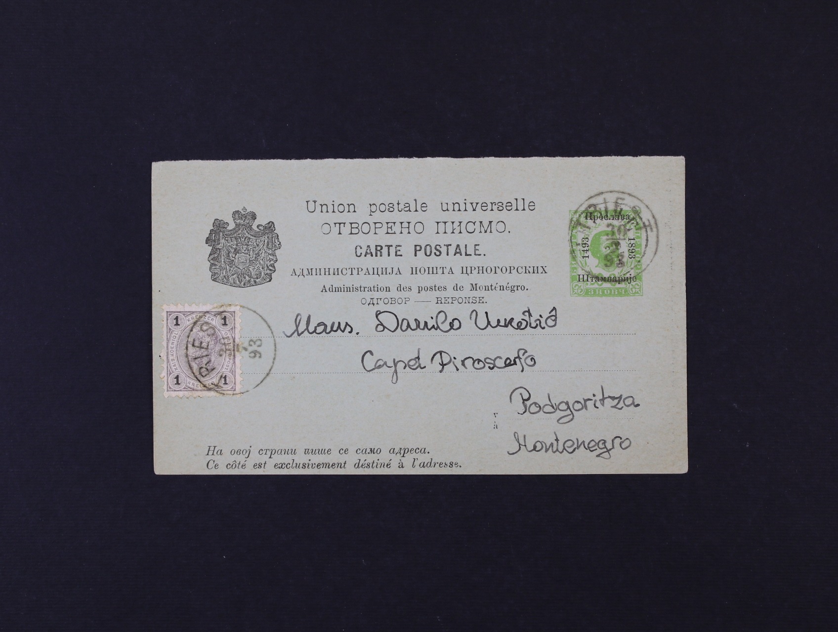 celina P 11 odpovědní část dofrank. zn. Mi. č. 50, zaslaná do Podgorice, pod. raz. TRIEST 30.7.93, zajímavý doklad
