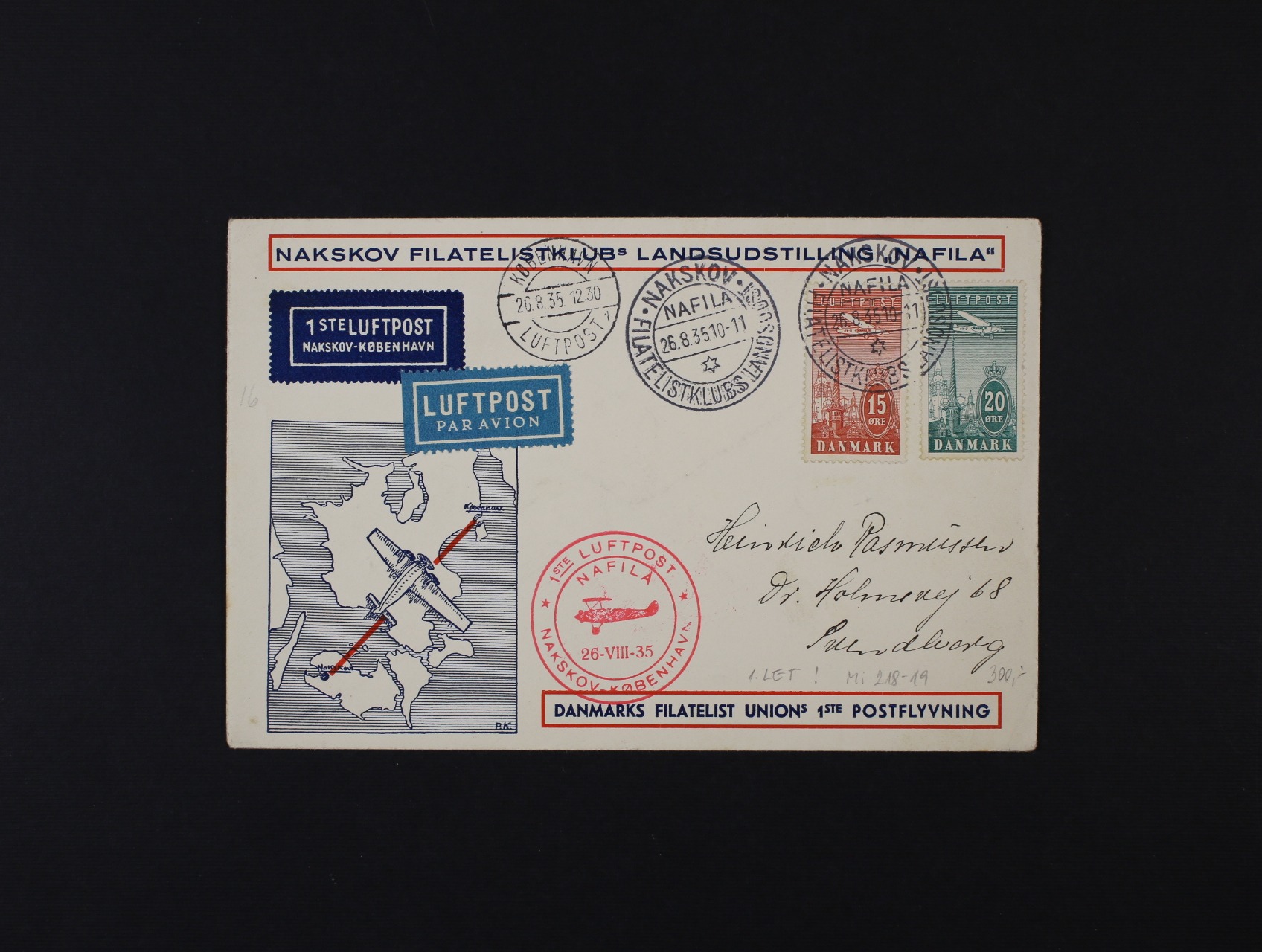 let. dopis frank. zn. Mi. č. 218 + 219, pod. raz. NAKSKOV ... NAFILA 26.8.35 + průch. raz. KOBENHAVEN LUFTPOST 26.8.35 + červený kulatý let. kašet 1. let Nakskov - Kobenhaven 26.8.35, dobrá kvalita, zajímavé