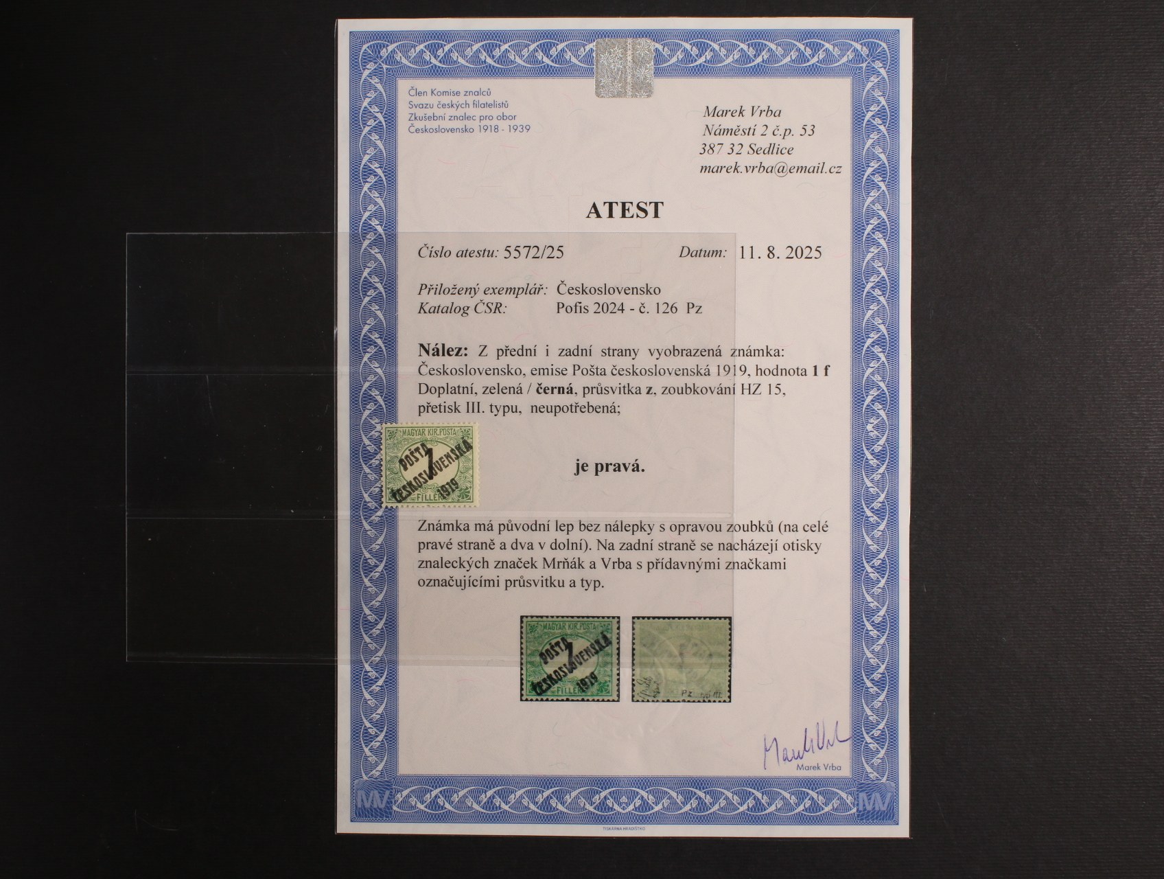 zn. č. 126, pr. 2, typ III, původní lep bez nálepky, na pravé straně opravené zloubkování, zk. Mrňák, atest Vrba