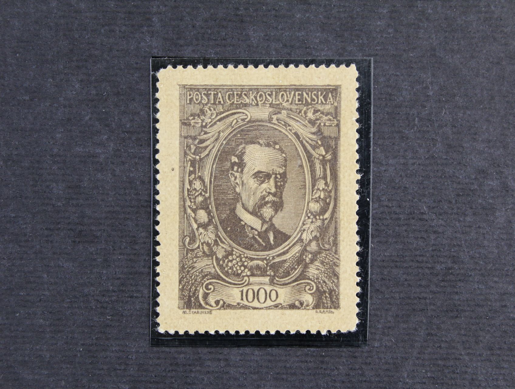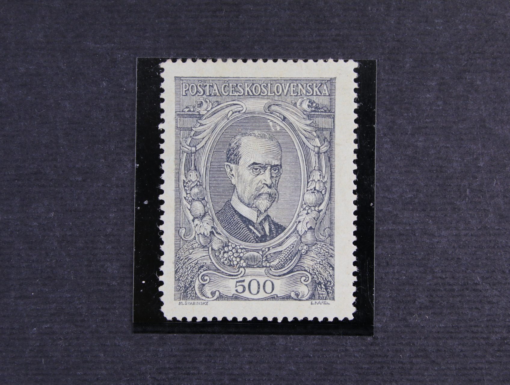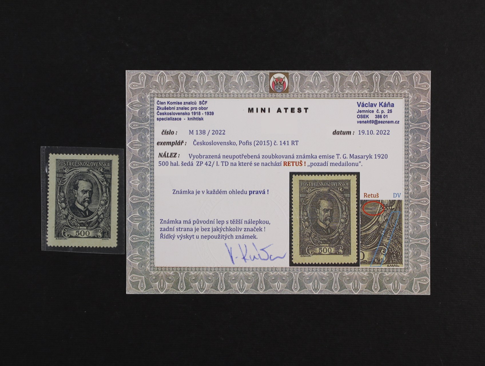zn. č. 141 500h TGM, retuš pozadí medailonu, původní lep, těžší nálepka, miniatest Káňa, kat. cena 6000 Kč