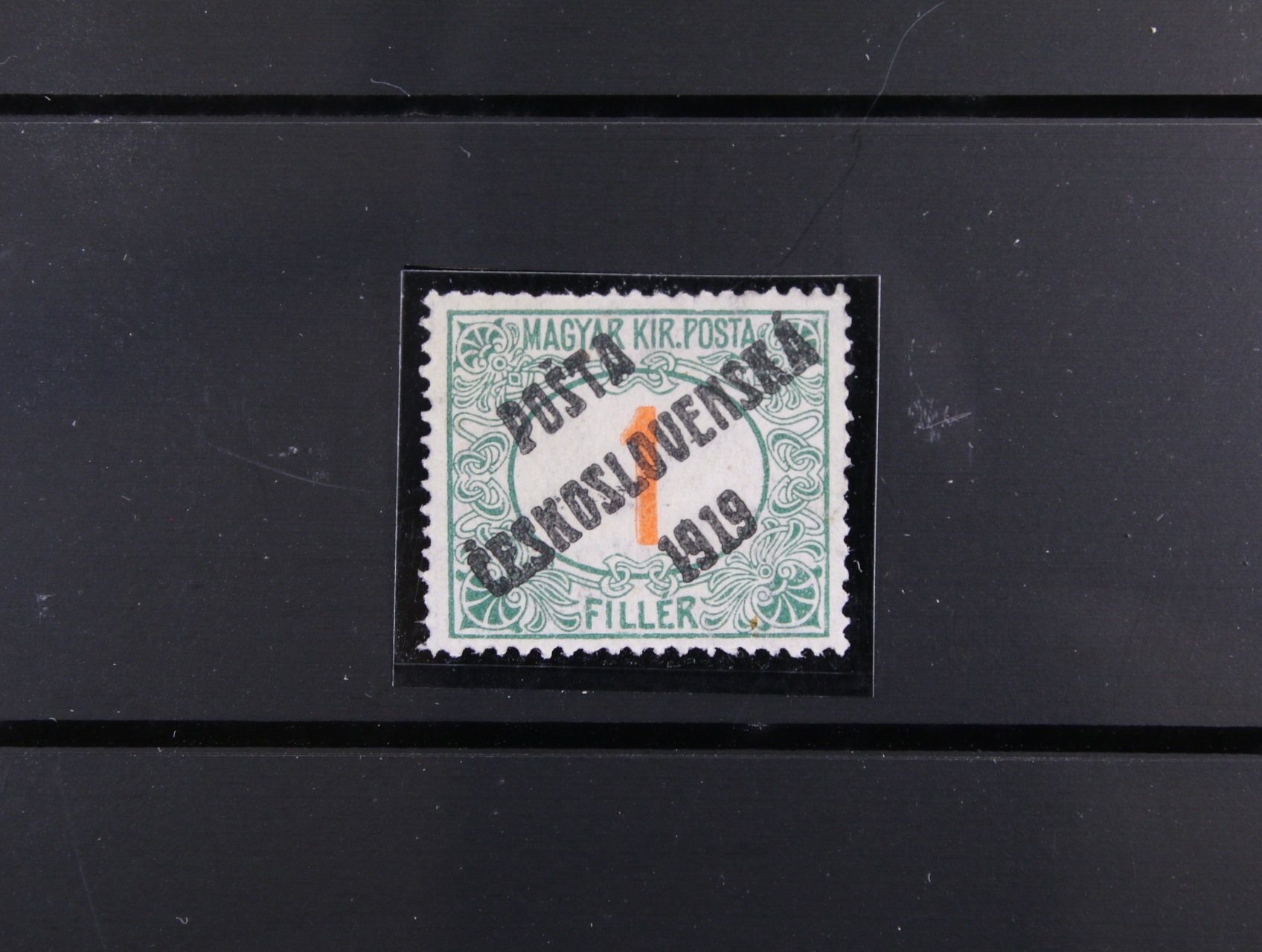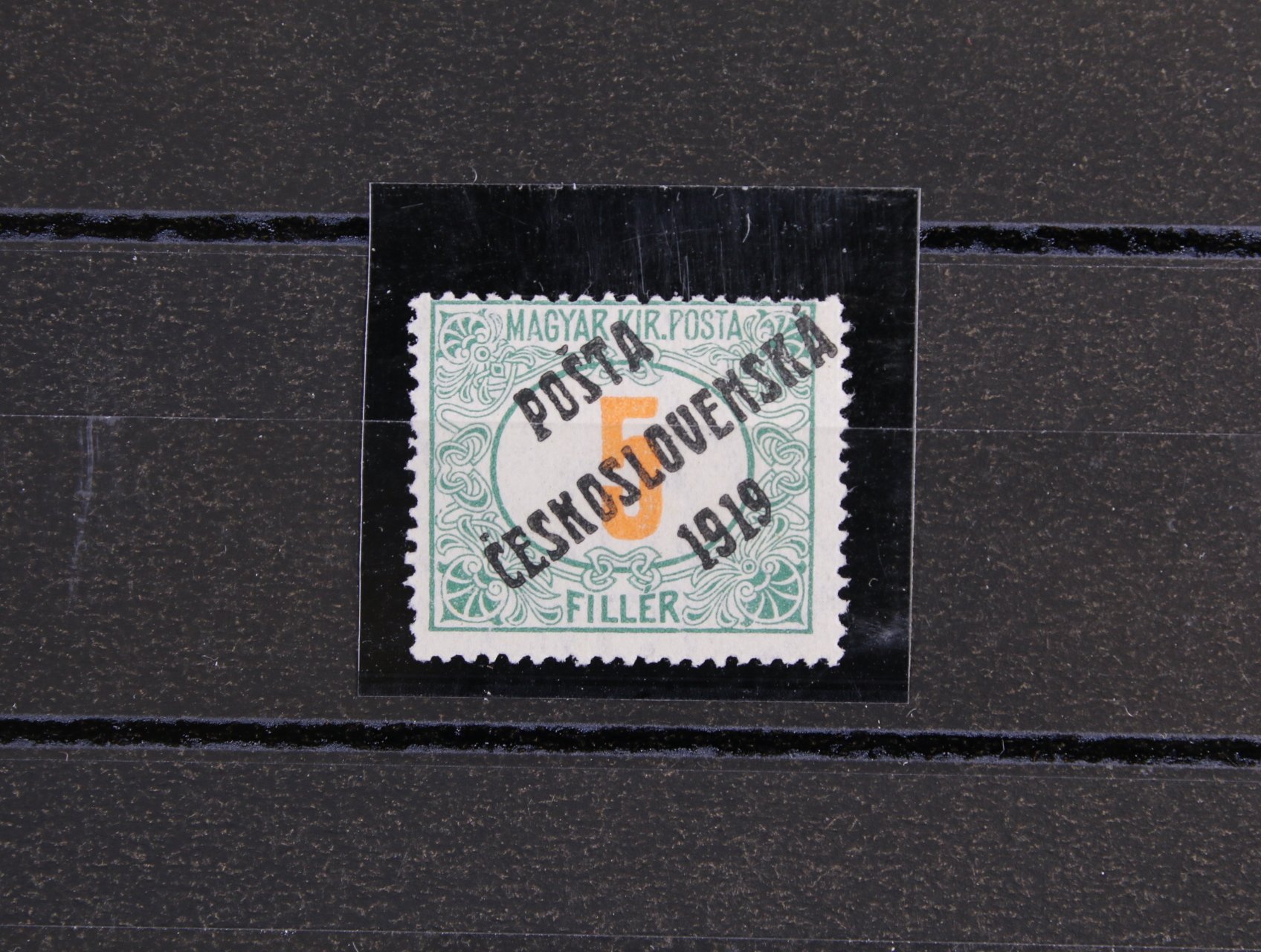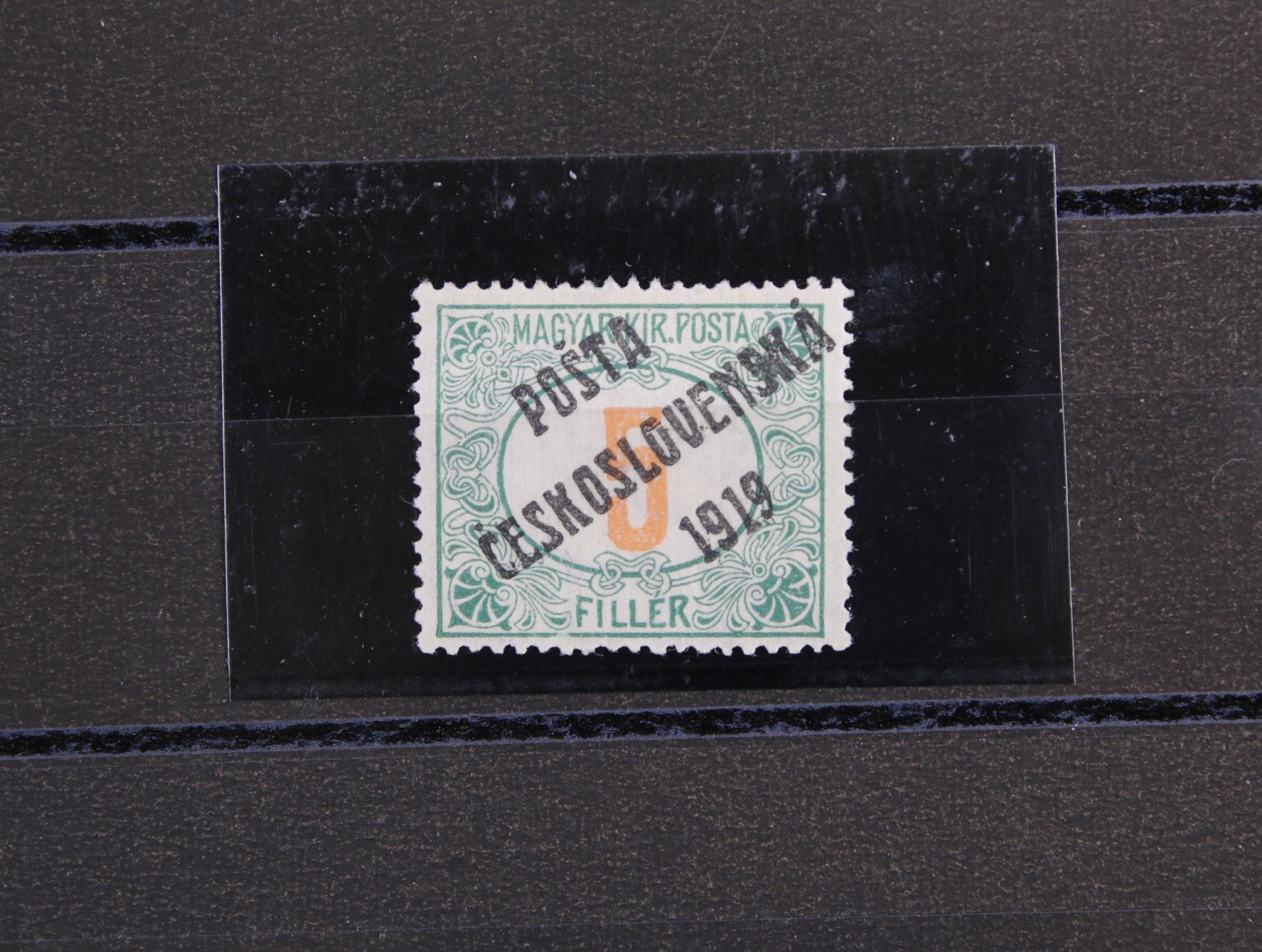 zn. č. 141 500h TGM, retuš pozadí medailonu, původní lep, těžší nálepka, miniatest Káňa, kat. cena 6000 Kč