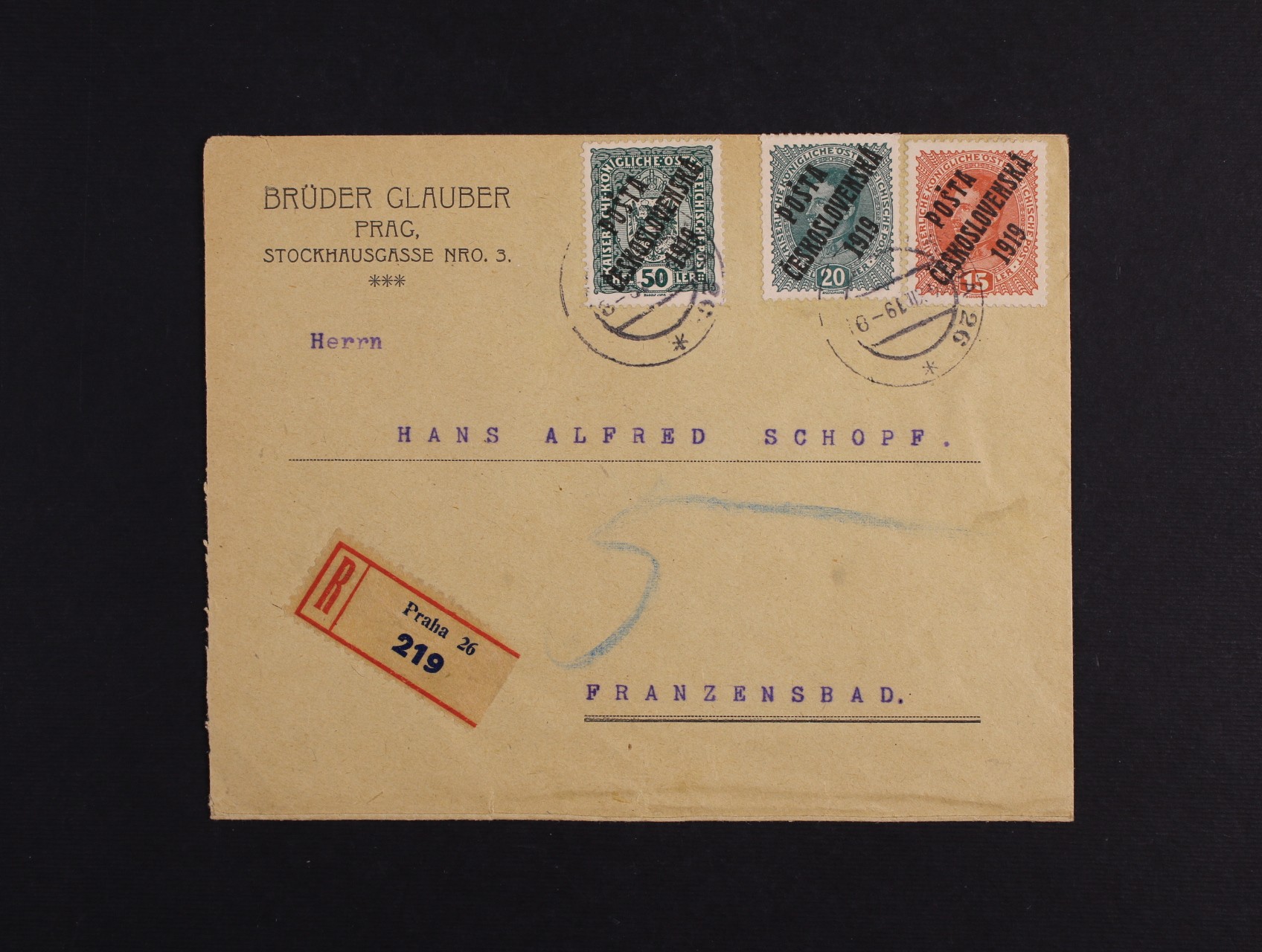 R-firemní obálka do Františkových Lázní frank. zn. č. 38, 39, 43, pod. raz. PRAHA 26 24.12.19
