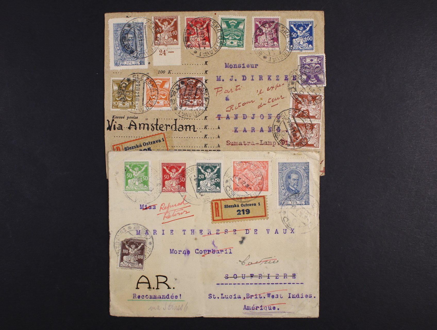 R-dopis do Holandské Indie frank. pestrou smíš. frankaturou TGM, Holubice, OR, mj. zn. 140, typ II, R-dopis na St. Lucia frank. pestrou vysokou frankaturou OR, HaV a TGM č. 140, typ I, pod., průch. a přích. raz., velmi zajímavé destinace, stopy pošt. provozu, vzácné