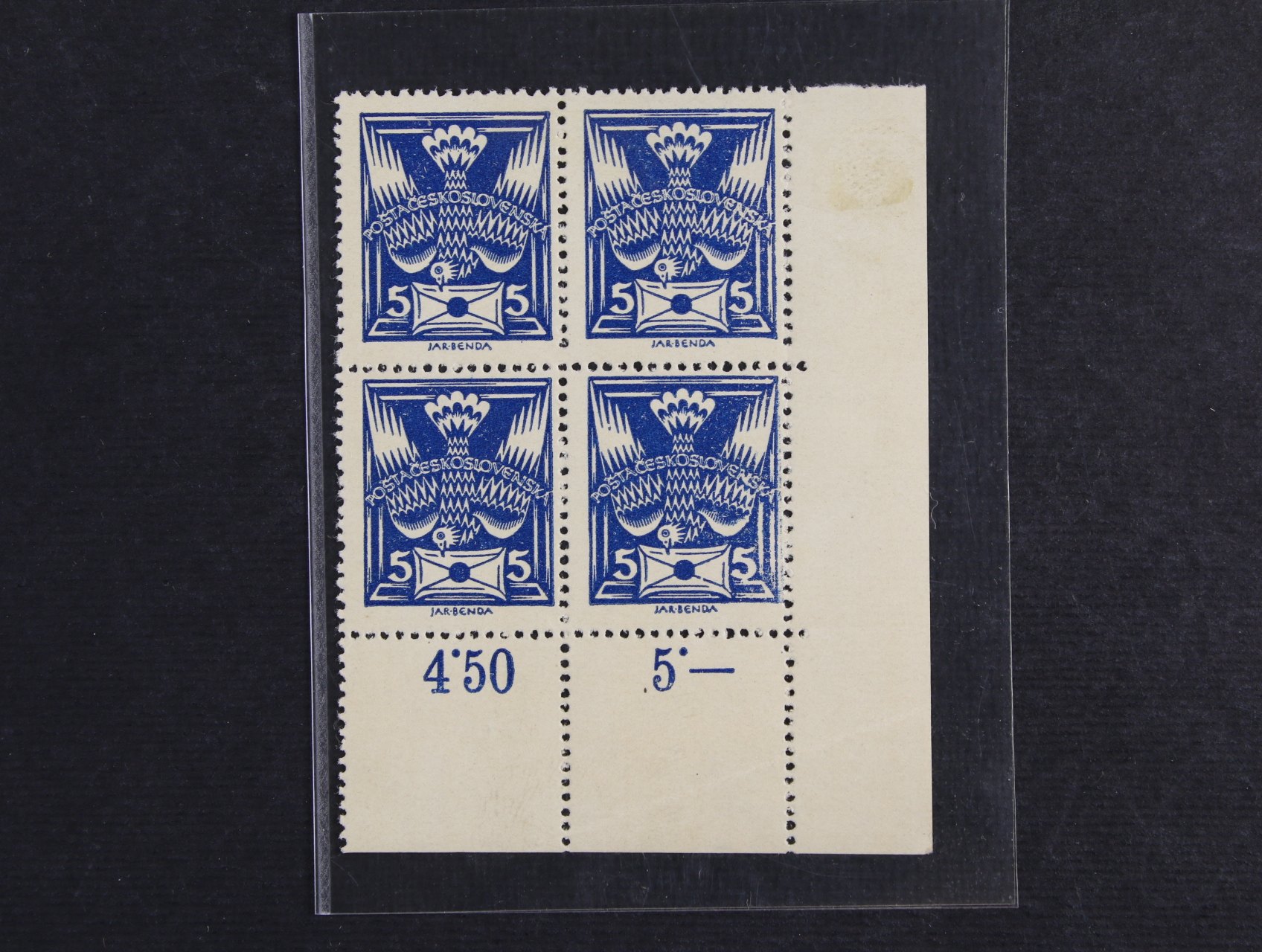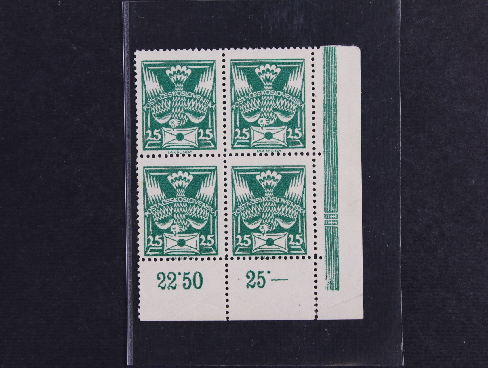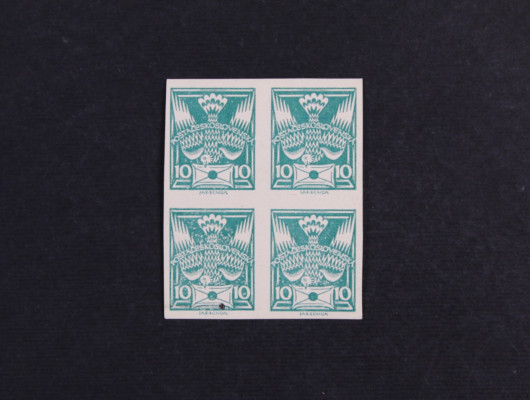 zn. č. 143 - pravý spodní roh. čtyřblok s DV přerušená čára v dopise a tečka v levém křídle na ZP 100, výrazný stroj. obtisk na lepu