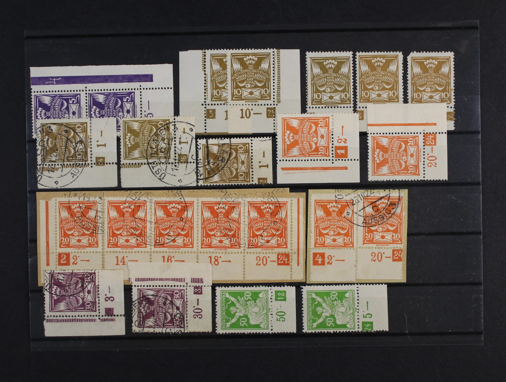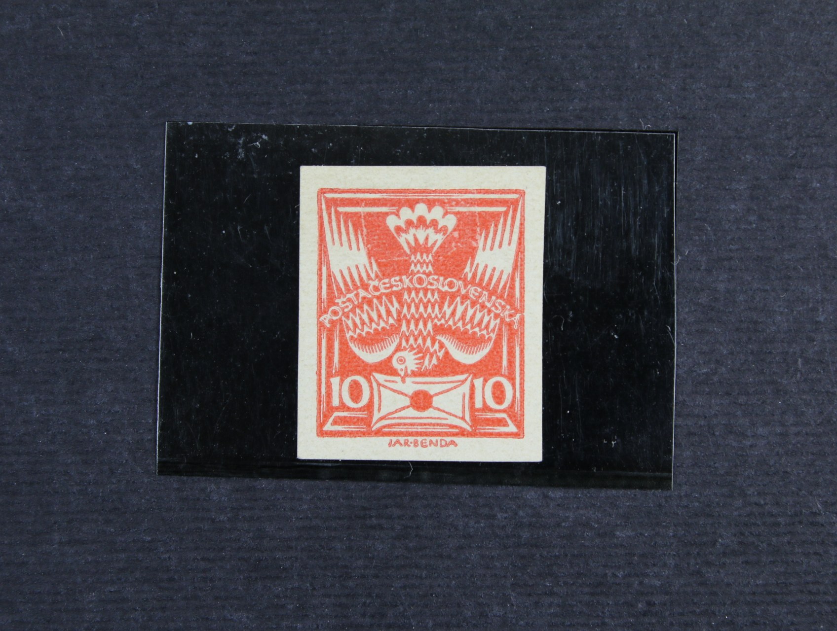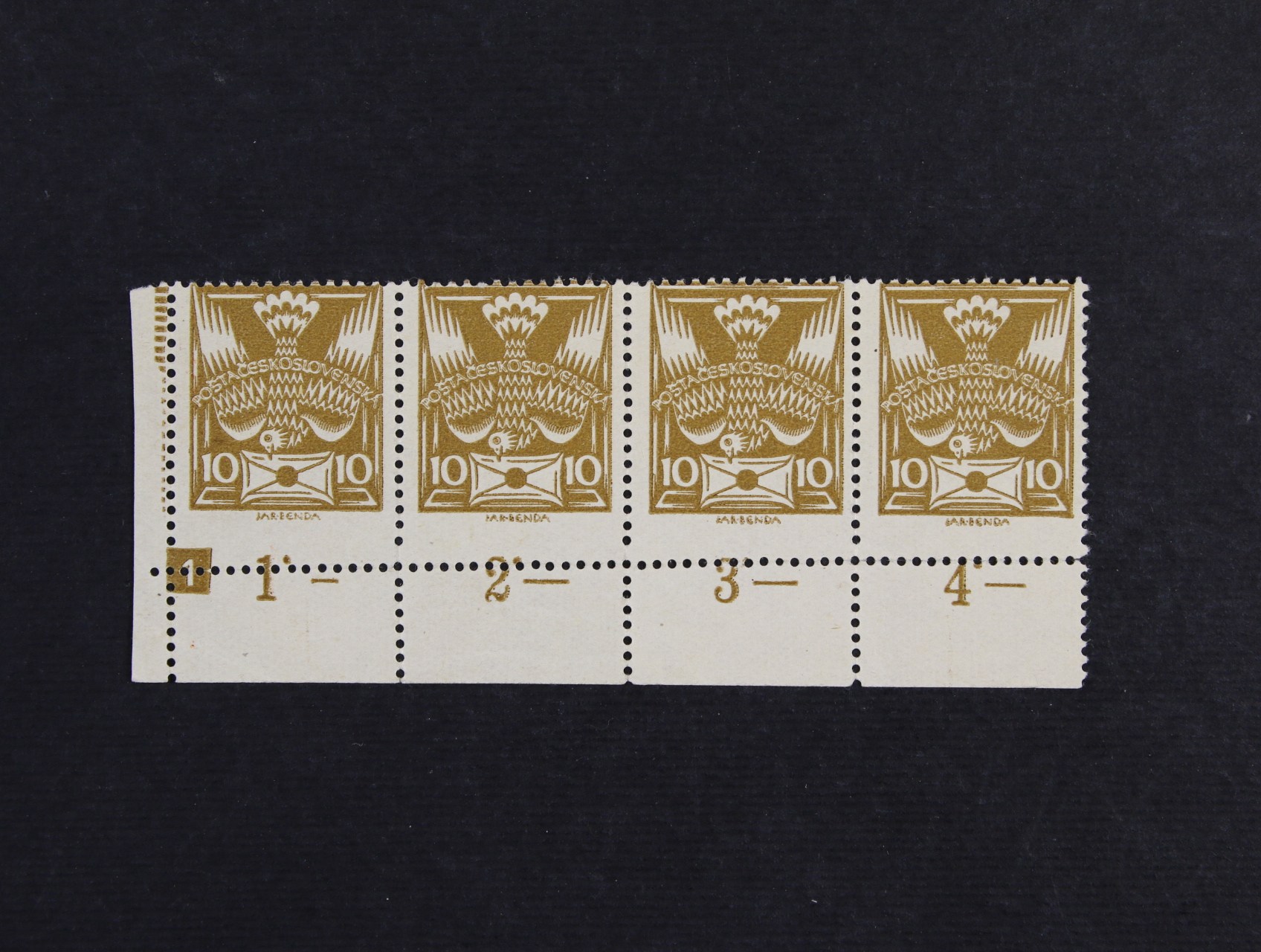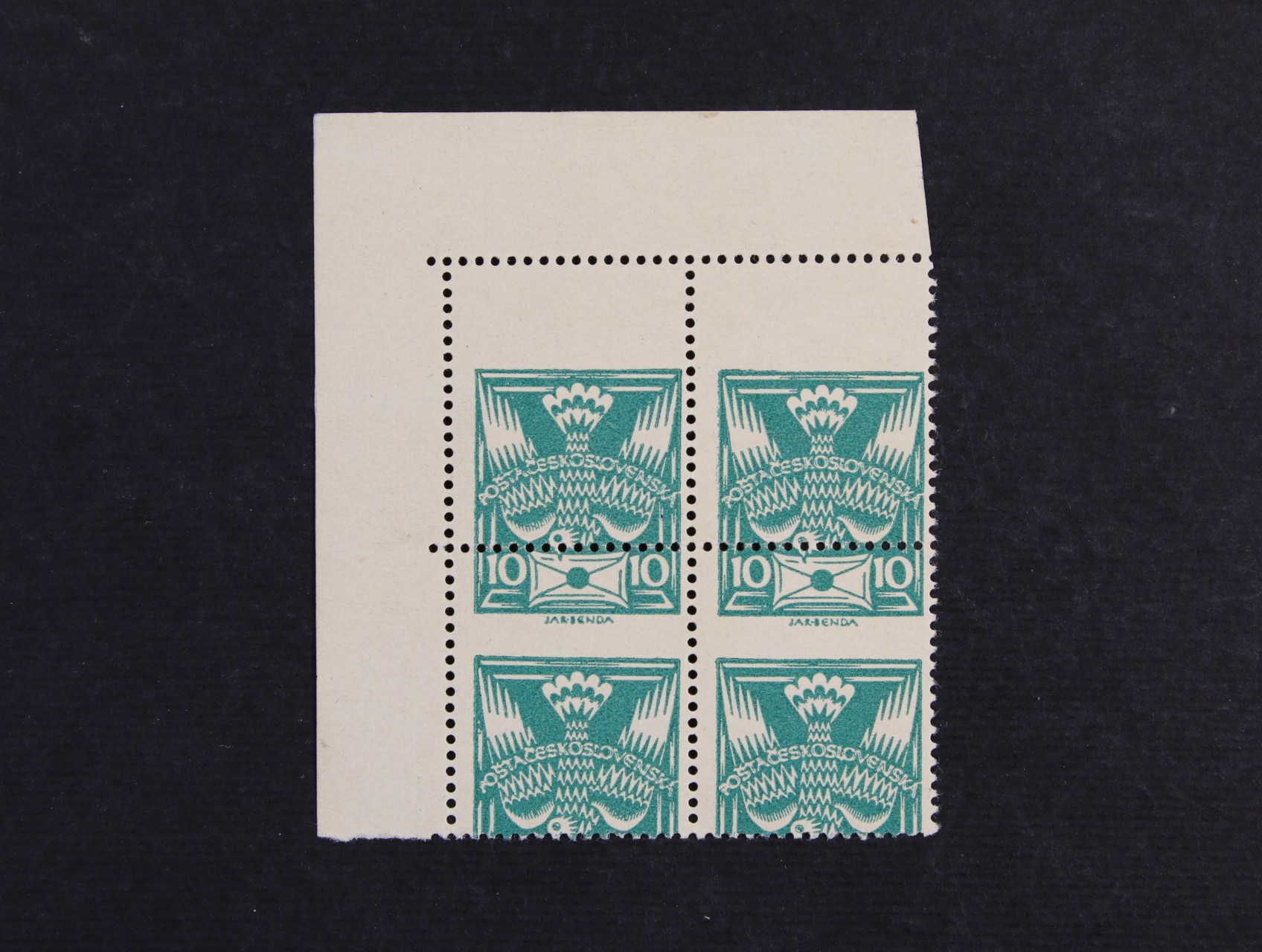 zn. č. 143 - pravý spodní roh. čtyřblok s DV přerušená čára v dopise a tečka v levém křídle na ZP 100, výrazný stroj. obtisk na lepu