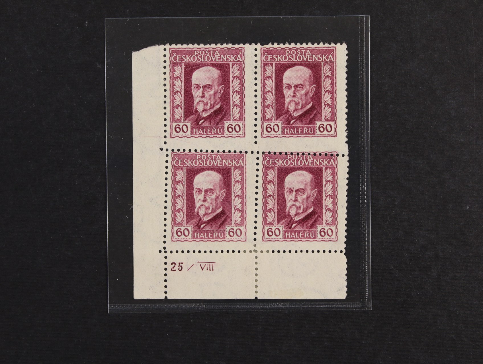 423 zn. č. 189 A, pr. 2, levý spodní roh. čtyřblok s DZ 26/VIII a šikmou vodorovnou i svislou perforací uprostřed 500