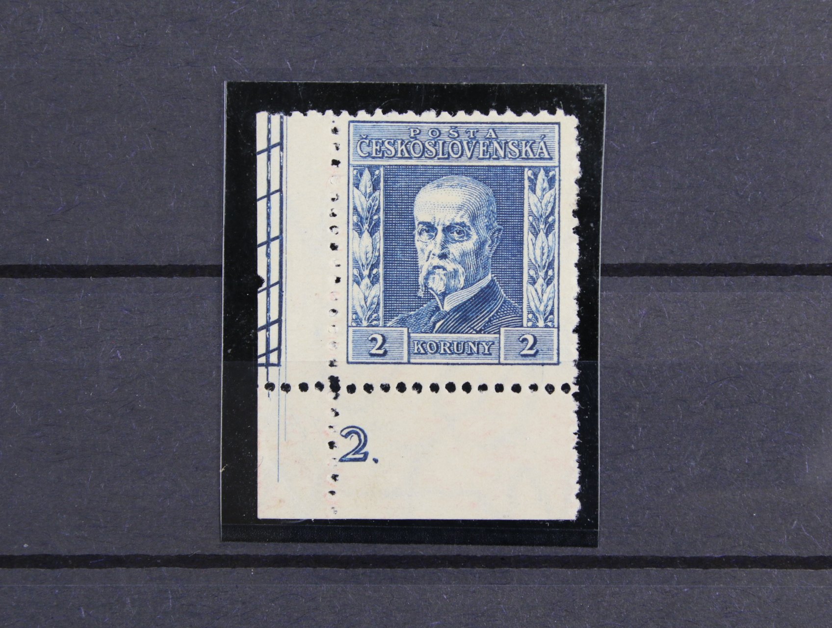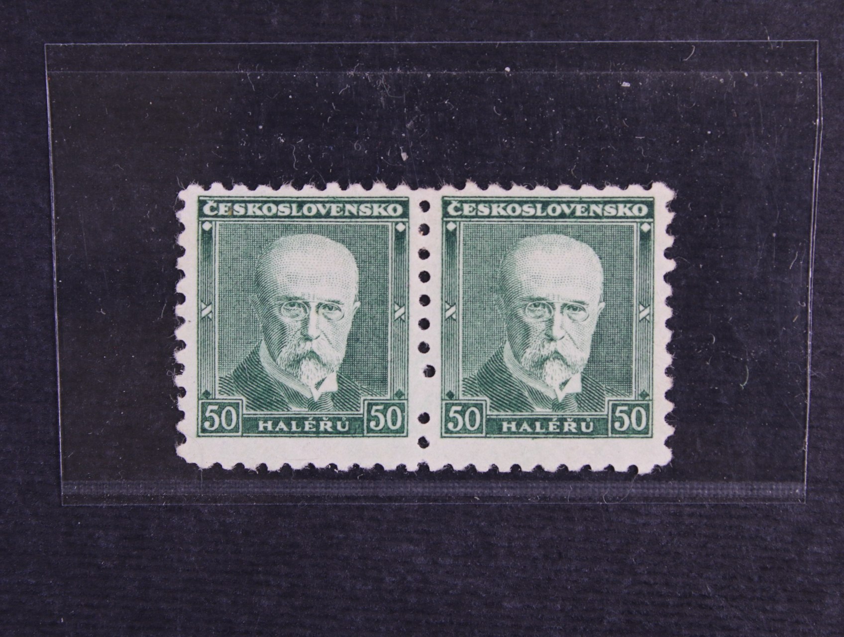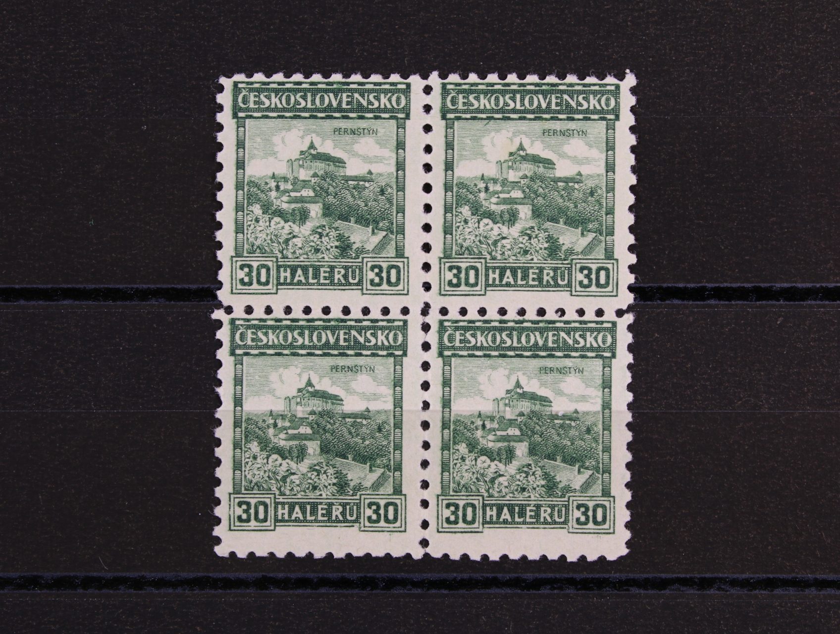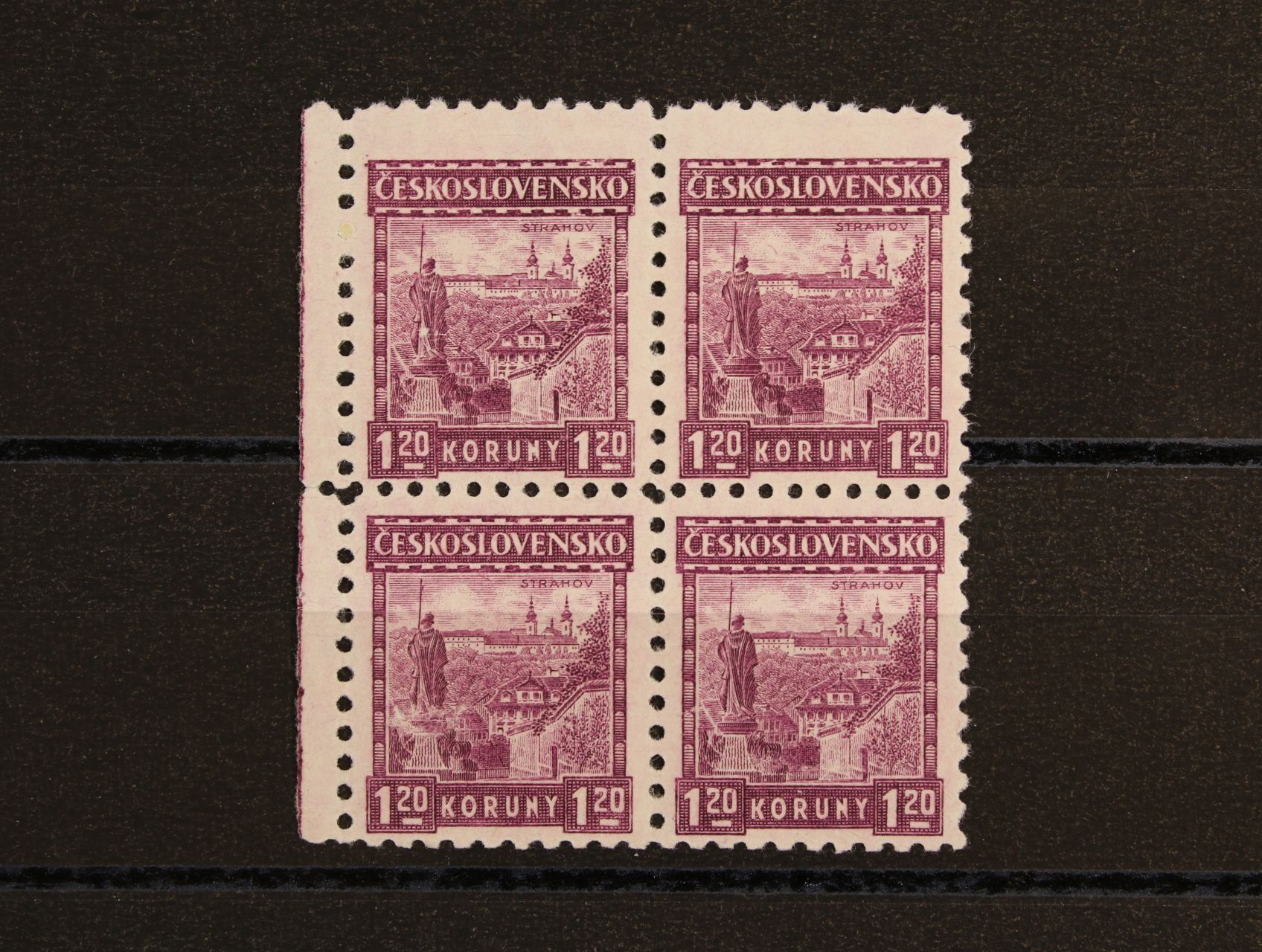 436 zn. č. 258, typ II, lep bez pruhů, ve vodorovné dvoupásce s vynechaným perf. otvorem ve svislé perfortaci (třetí zespodu) 400