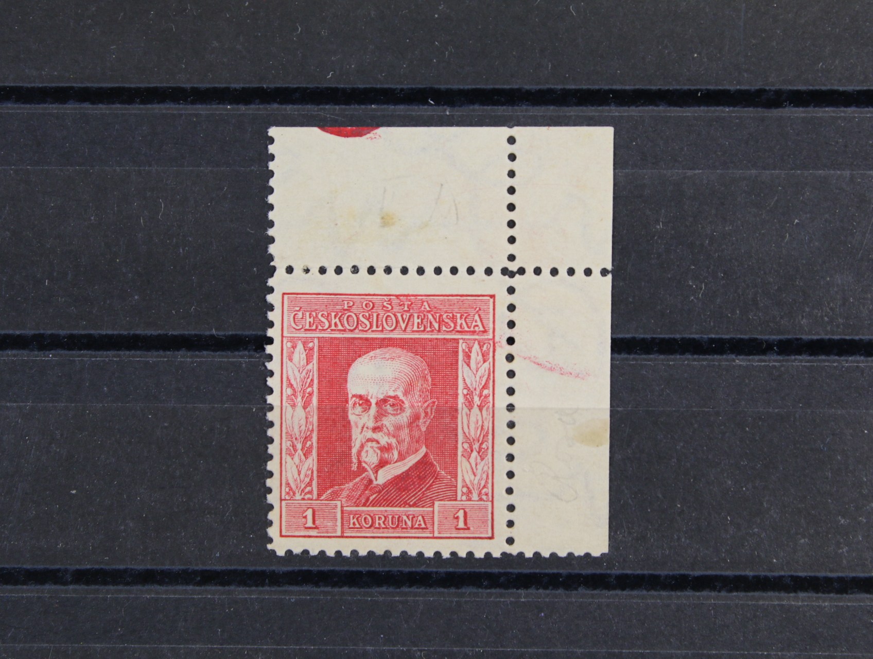 434 zn. č. 197, typ III, pr. 7, pravý horní roh. kus s částečným otiskem hřebu na horním okraji,. zk. Vrba 300