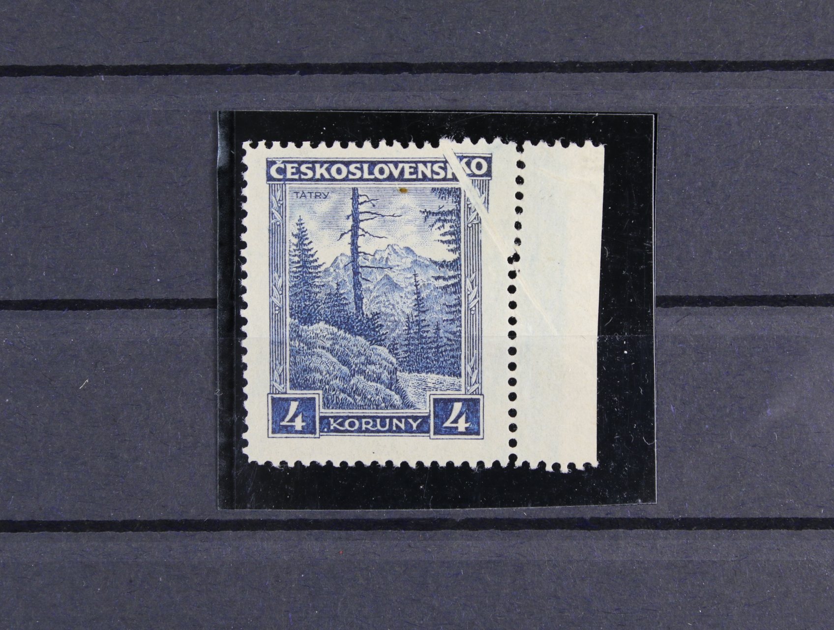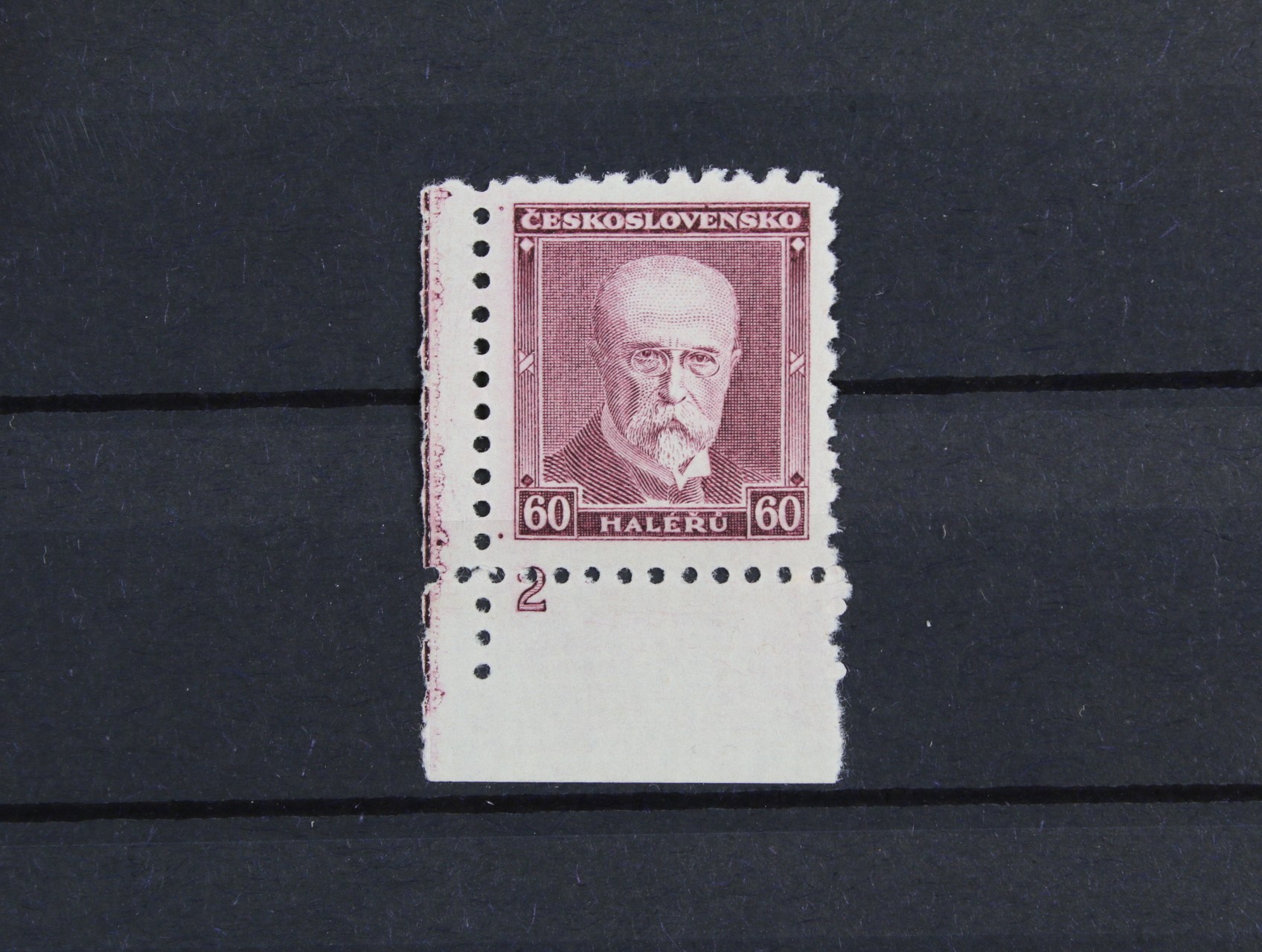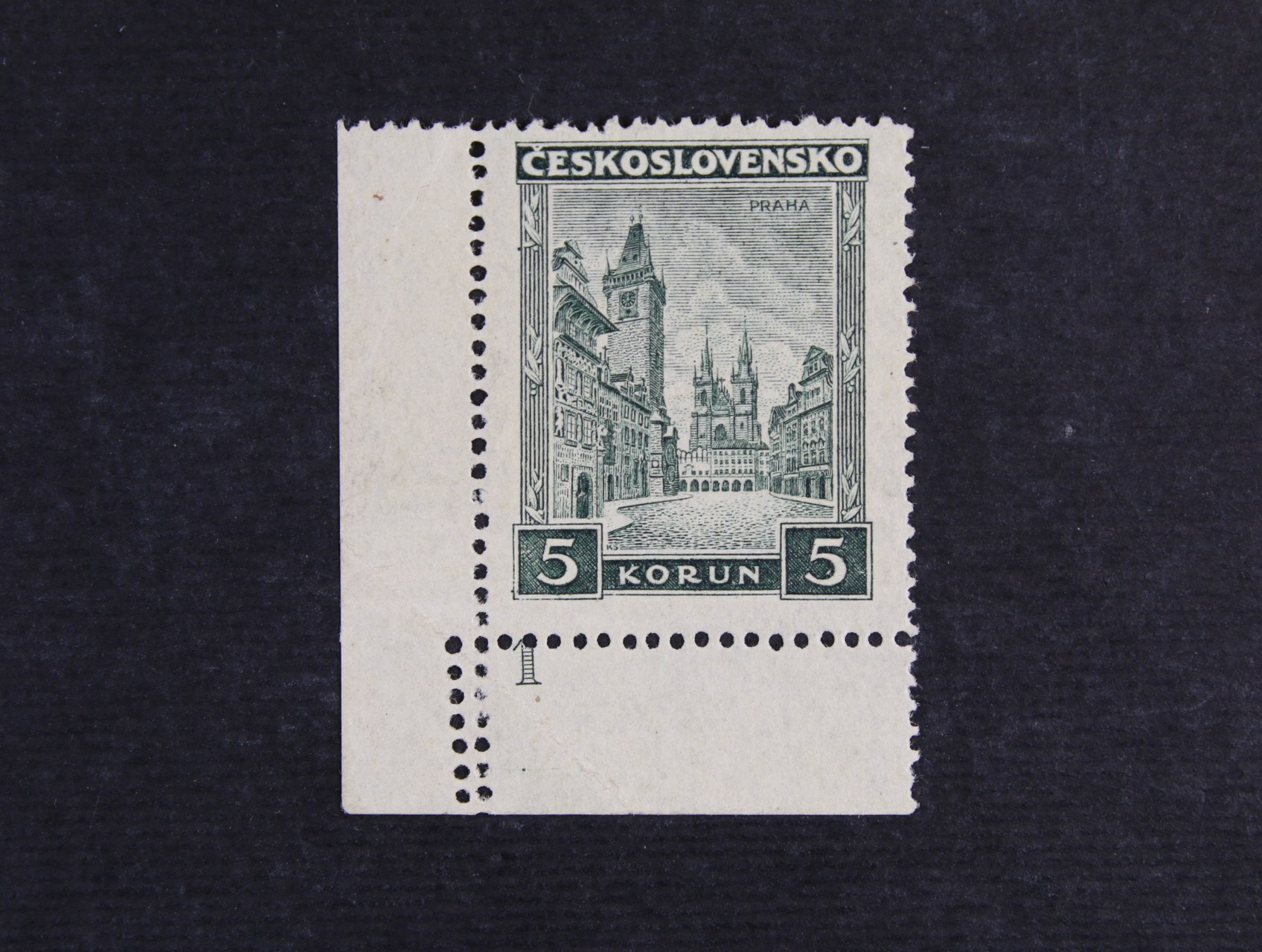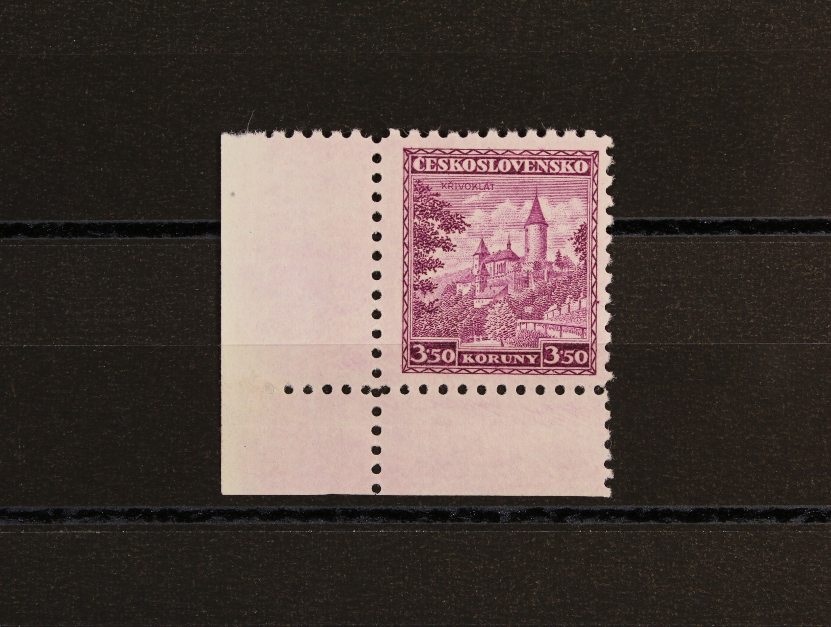 480 zn. č. 265 levý dolní rohový kus bez DČ, široký okraj, nepatrná stopa po nálepce na okraji 600