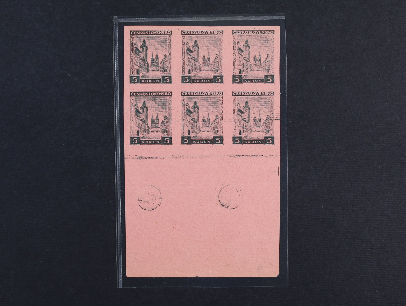 470 ZT zn. č. 256 v 6ti-bloku v orig. barvě na růžovém papíře se spodním okrajem a otisky hřebů, kat. cena cca 1000 Kč 700