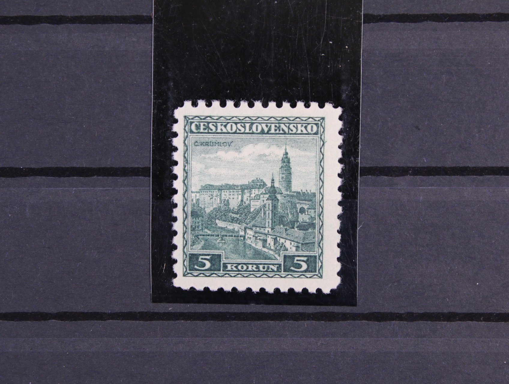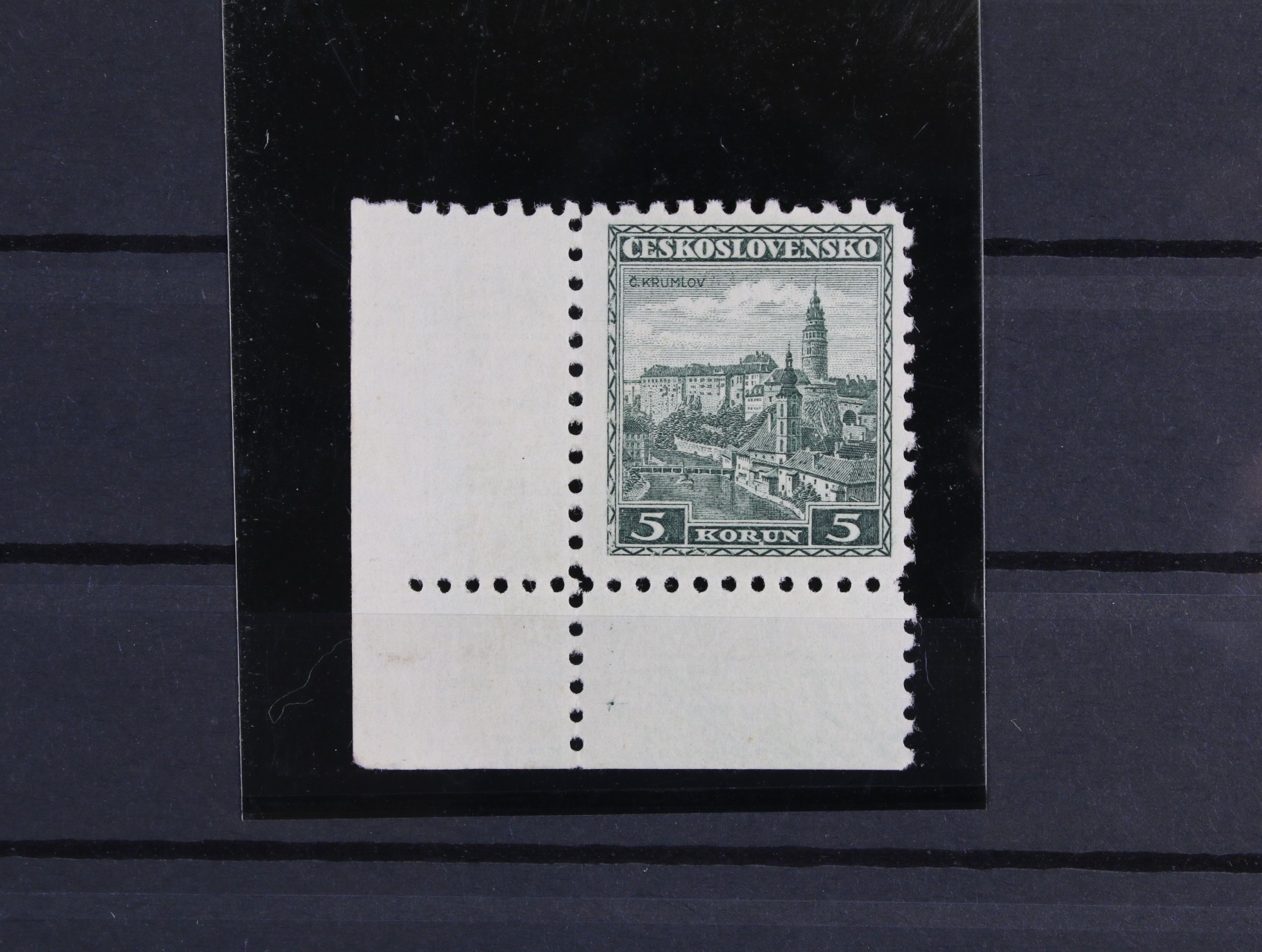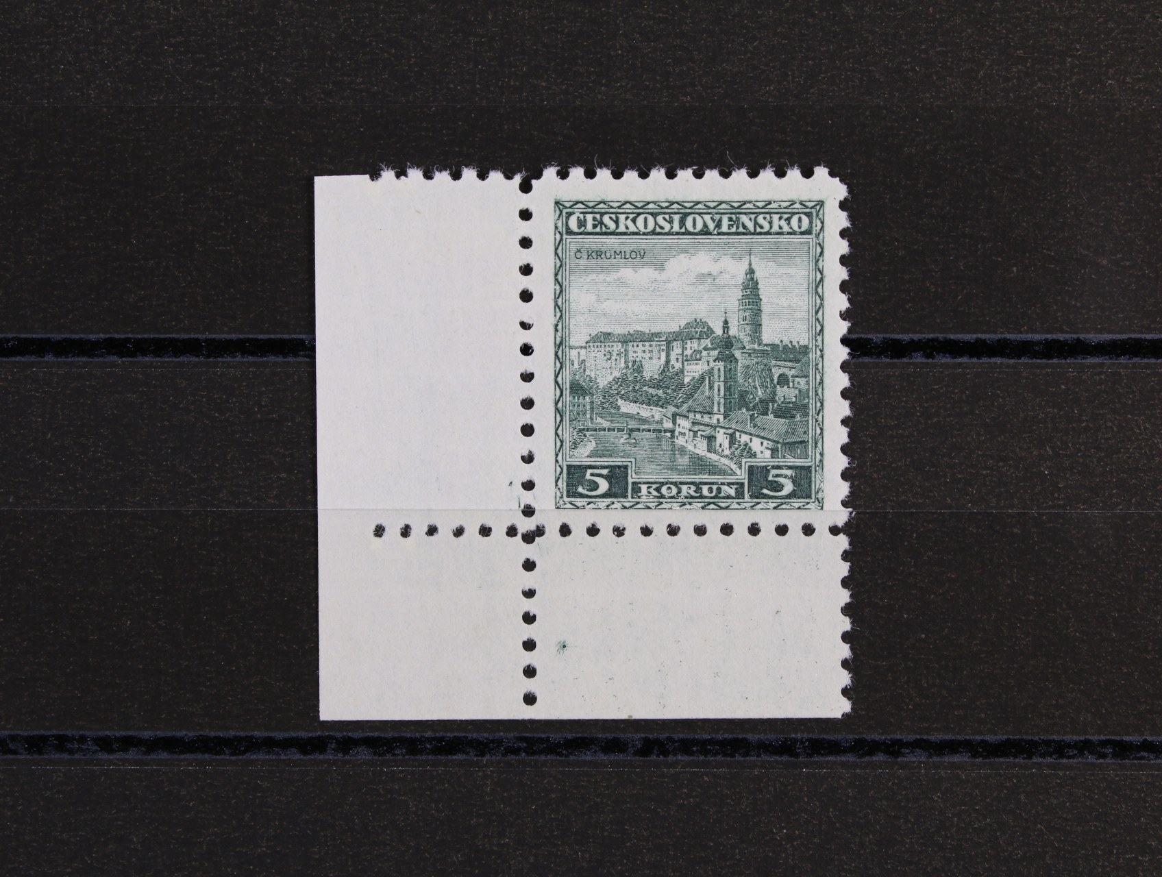 zn. č. 267 levý dolní rohový kus bez DČ, široký okraj, nepatrná stopa po nálepce na okraji