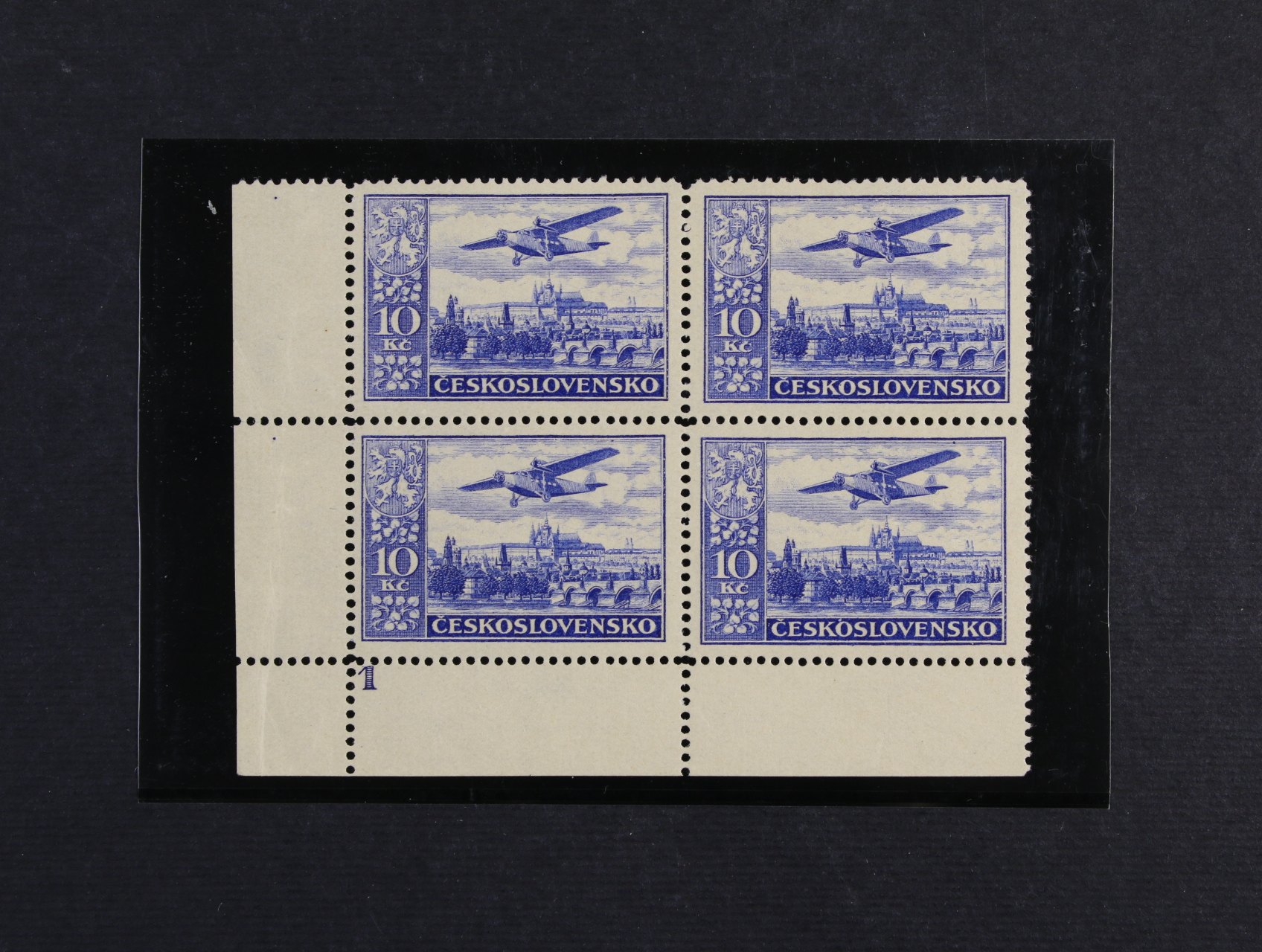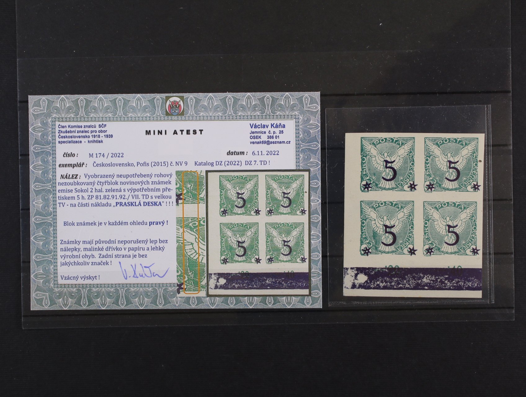 614 zn. NV č. 9 - levý spodní roh. čtyřblok s VV prasklá deska (jen na části nákladu), velmi zajímavé, vzácné, miniatest Káňa 1500