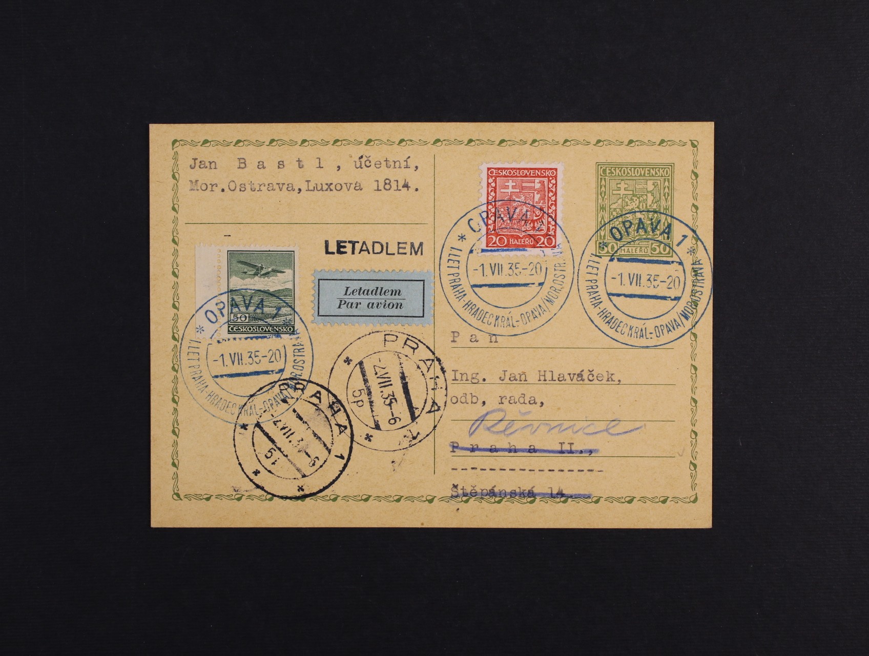 603 1. let Praha - Hradec Králové - Opava na CDV č. 49 dofrank. zn. č. 250 a L7 I. typ úzký, podací razítko Opava 1 1.7.35 a doručovací razítko Praha 2.7.35 300