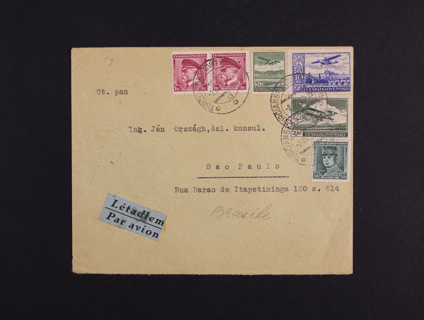 604 let. dopis do Brazílie frank. pestrou smíš. vysokou frankaturou, pod. raz. TURČIANSKÝ SVÄTÝ MARTIN 2.12.38, průch. raz. COREIO AEREO S. PAULO 7.12.38 500