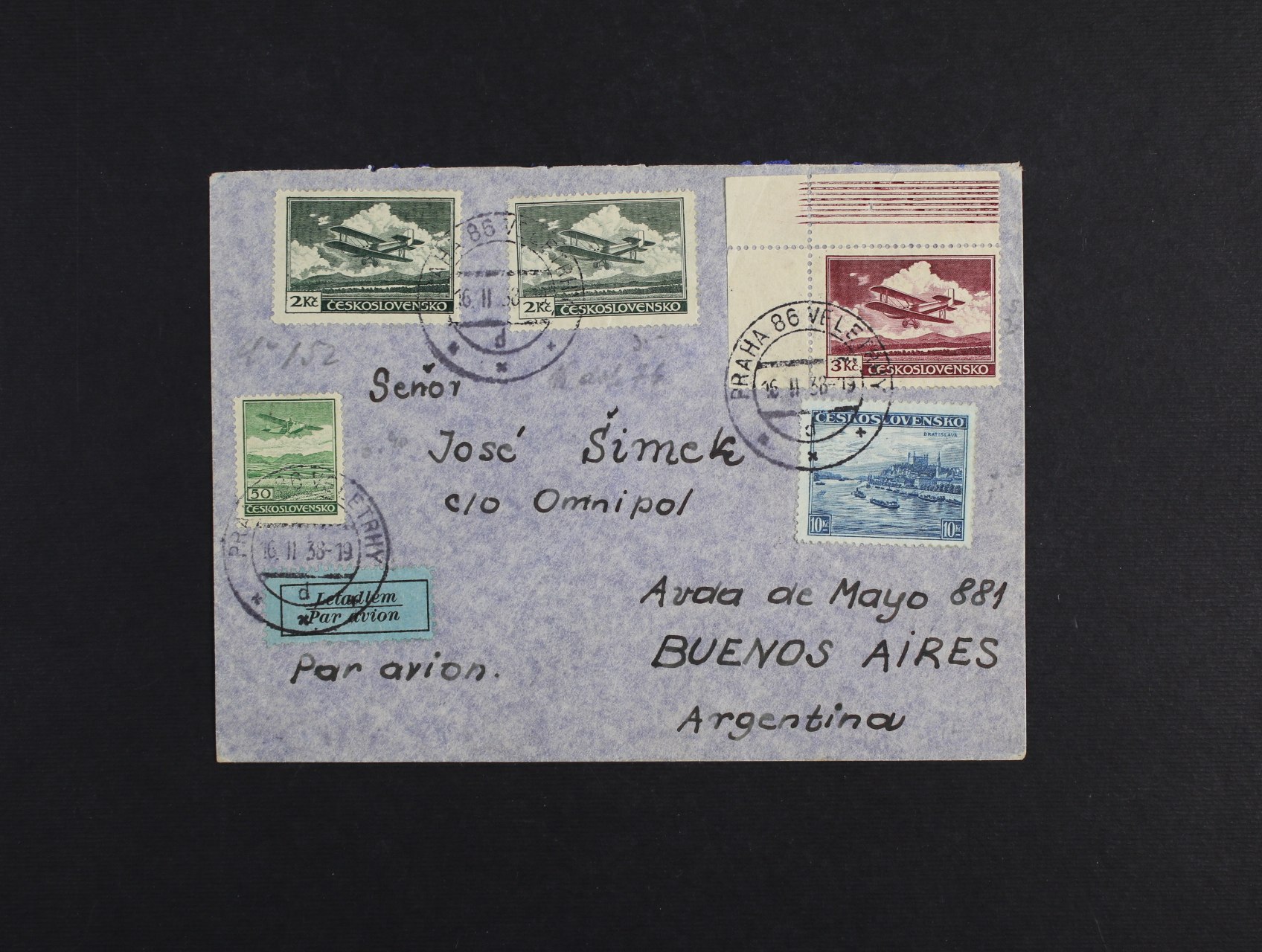 605 let. dopis do Buenos Aires frank. zn. č. 313, L č. 7, L 9 (2x), L 10 - rohový kus, typ III, zajímavá smíš. frankatura, pod. raz. PRAHA VELETRHY 16.2.38, průch. raz. PRAHA 7 + rámeč. dvojjazyčné raz. PRAHA 7 LETECKÁ POŠTA 16.2.38, dobrá kvalita 500