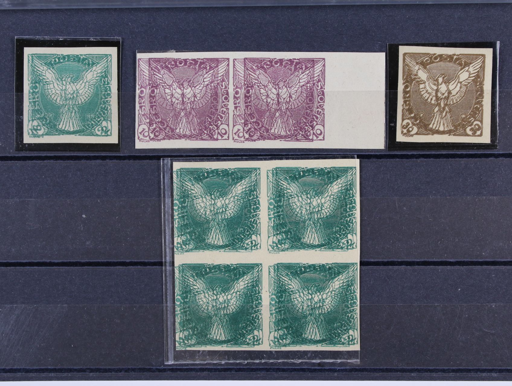 610 zn. NV č. 1 + NV 1 ve čtyřbloku, NV 4 ve dvoupásce s pravým okrajem, zn. NV 6 - vše dvojité tisky, zajímavé 600