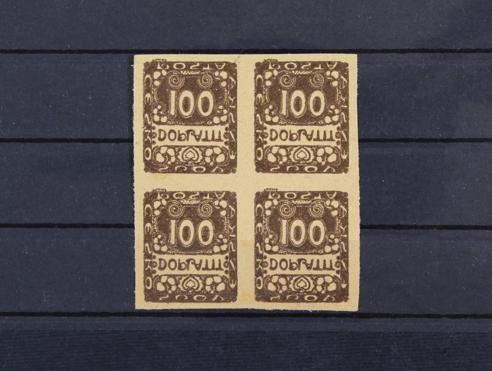 619 ZT zn. DL č. 9 ve čtyřbloku v orig. barvě na nažloutlém papíře s výrazným stroj. obtiskem 200