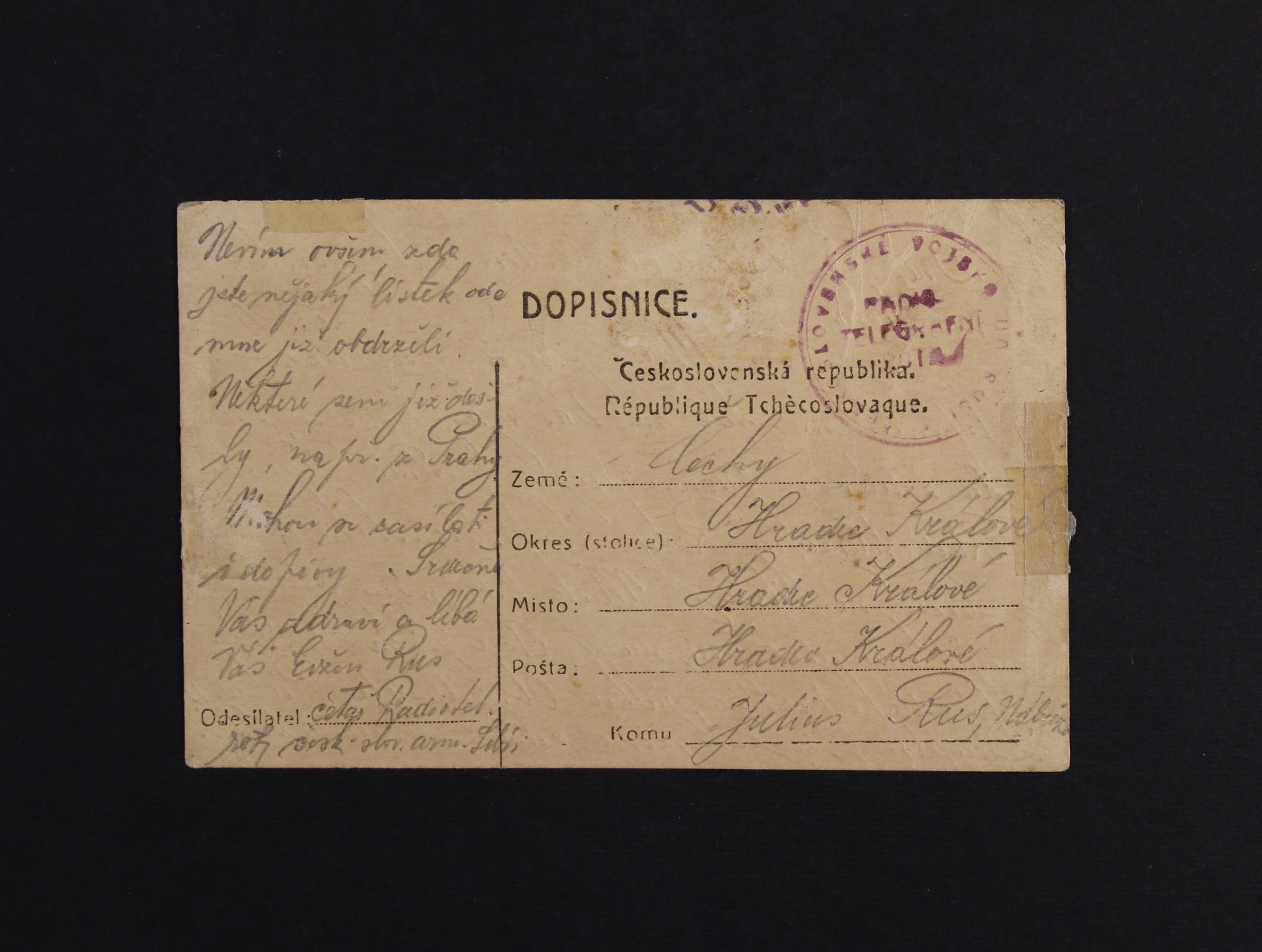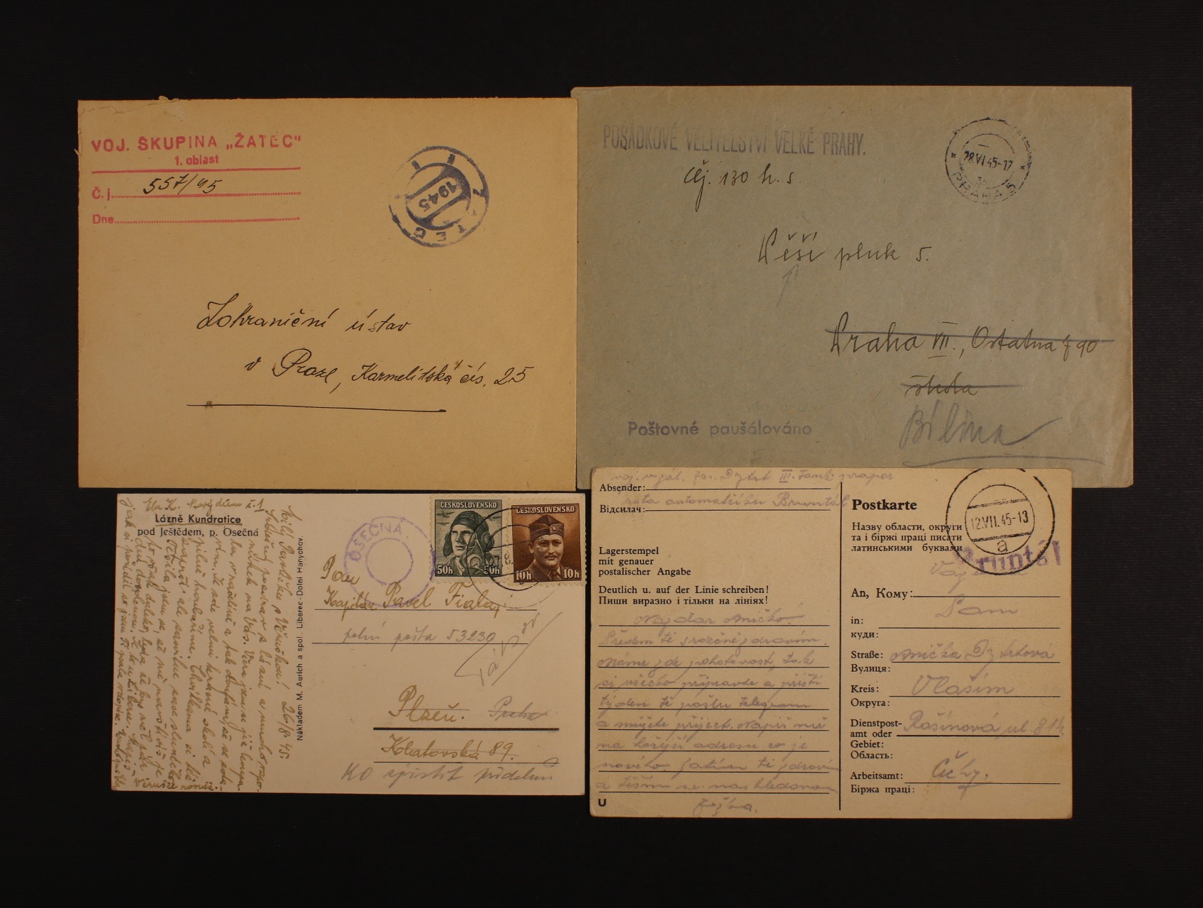 sestava 4 ks celistvostí mezi posádkami v ČSR po roce 1945 - pohlednice z Osečné na vojáka Svobodovy armády do Plzně, služební dopis z Vojenské skupiny Žatec do Prahy, služ. dopis z posádkového velitelství Praha do nově vzniklého pěšího pluku č. 5 v Bílině a dopis od příslušníka III. Tank. praporu v Bruntále